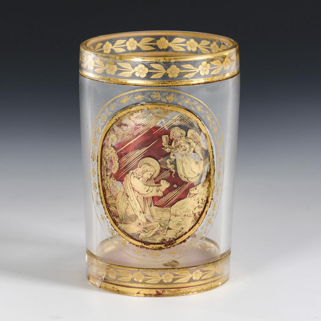 Cylindrical beaker, on the front an oval medallion with a depiction of Christ painted and engraved in gold and backed with a red foil, gold bottom rosette over red foil. Medallion with stress crack, foil defective, stress crack on the stand, gold rubbed.