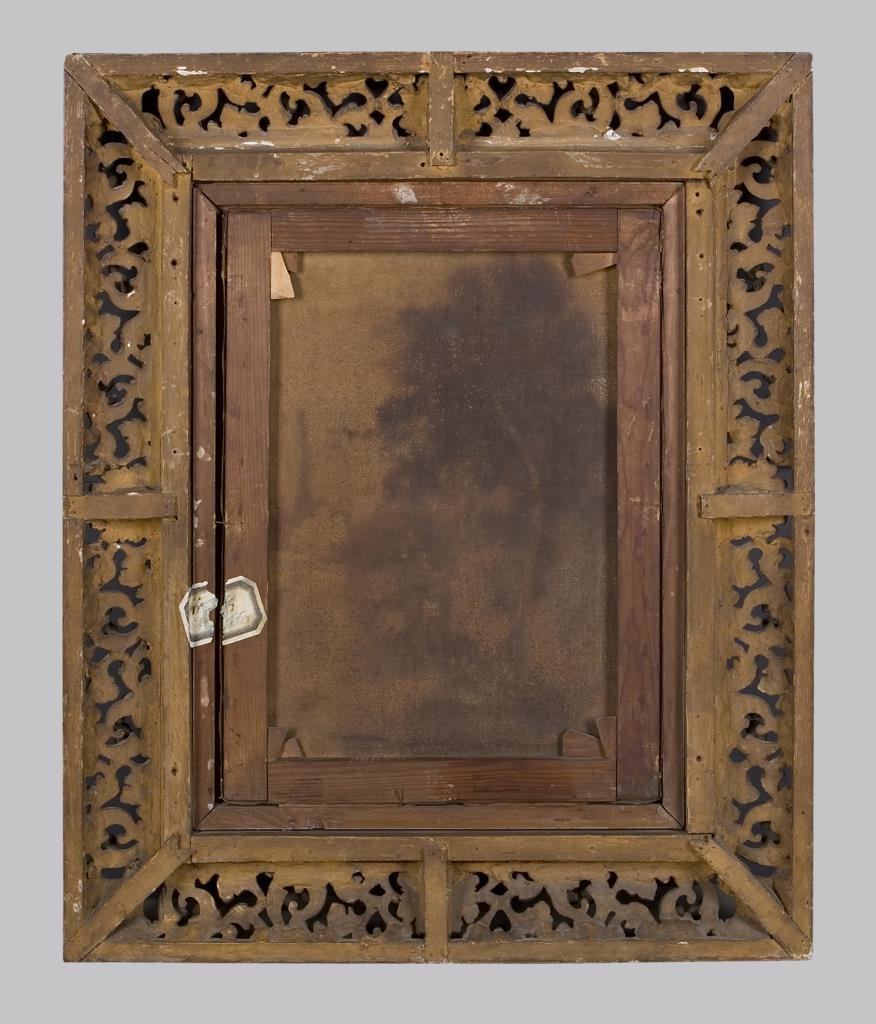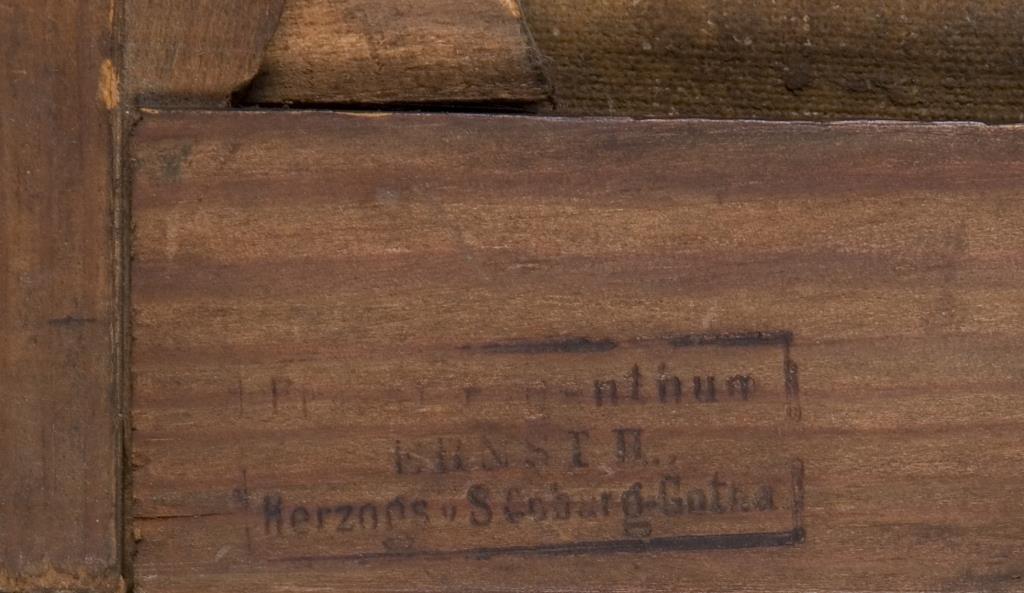 Originaler Keilrahmen. Rückseitig Stempel: Privateigentum Ernst II. Herzog von Sachsen-Coburg-Gotha. Breiter originaler, durchbrochen gearbeiteter vergoldeter Stuckrahmen.