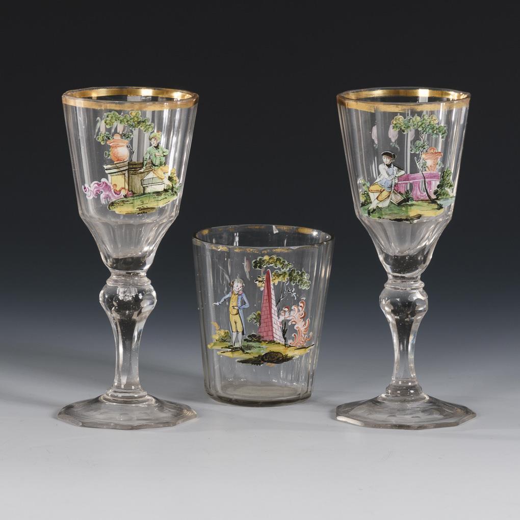 2 goblets with faceted dome, faceted baluster stem and octagonal foot with lenticular cut. / 1 faceted goblet. All with obverse depiction of a rococo gentleman in a park. Gold rubbed, 1 goblet with chip on rim and foot, goblet with small rim bump.