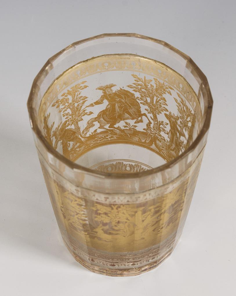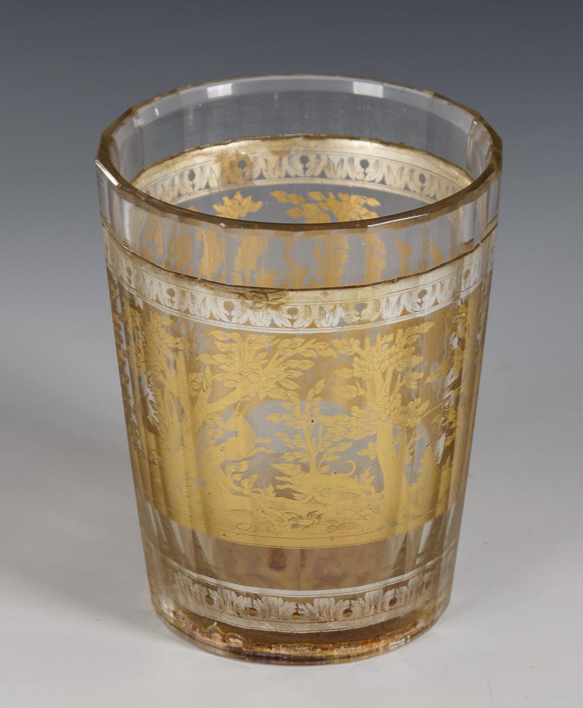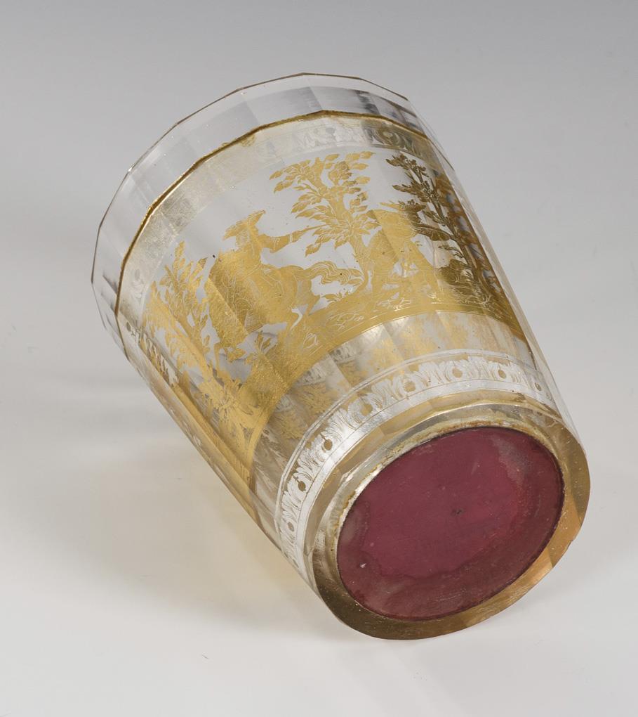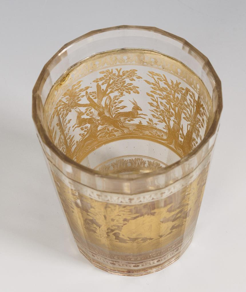 Conical cup with faceted outer wall. Between acanthus leaf borders in etched silver foil the surrounding depiction of a forest landscape with two hares, hounds and three hunters, some mounted. In the bottom a hunter and deer in etched gold foil before red background. Minimal chip on the stand, yellowed traces of glue in the glass.