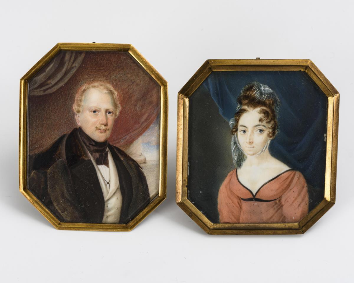 Gouache. 8 x 7 cm and 9 x 7 cm respectively, each glazed octagonal brass frame maximum 9.5 x 7.5 cm.