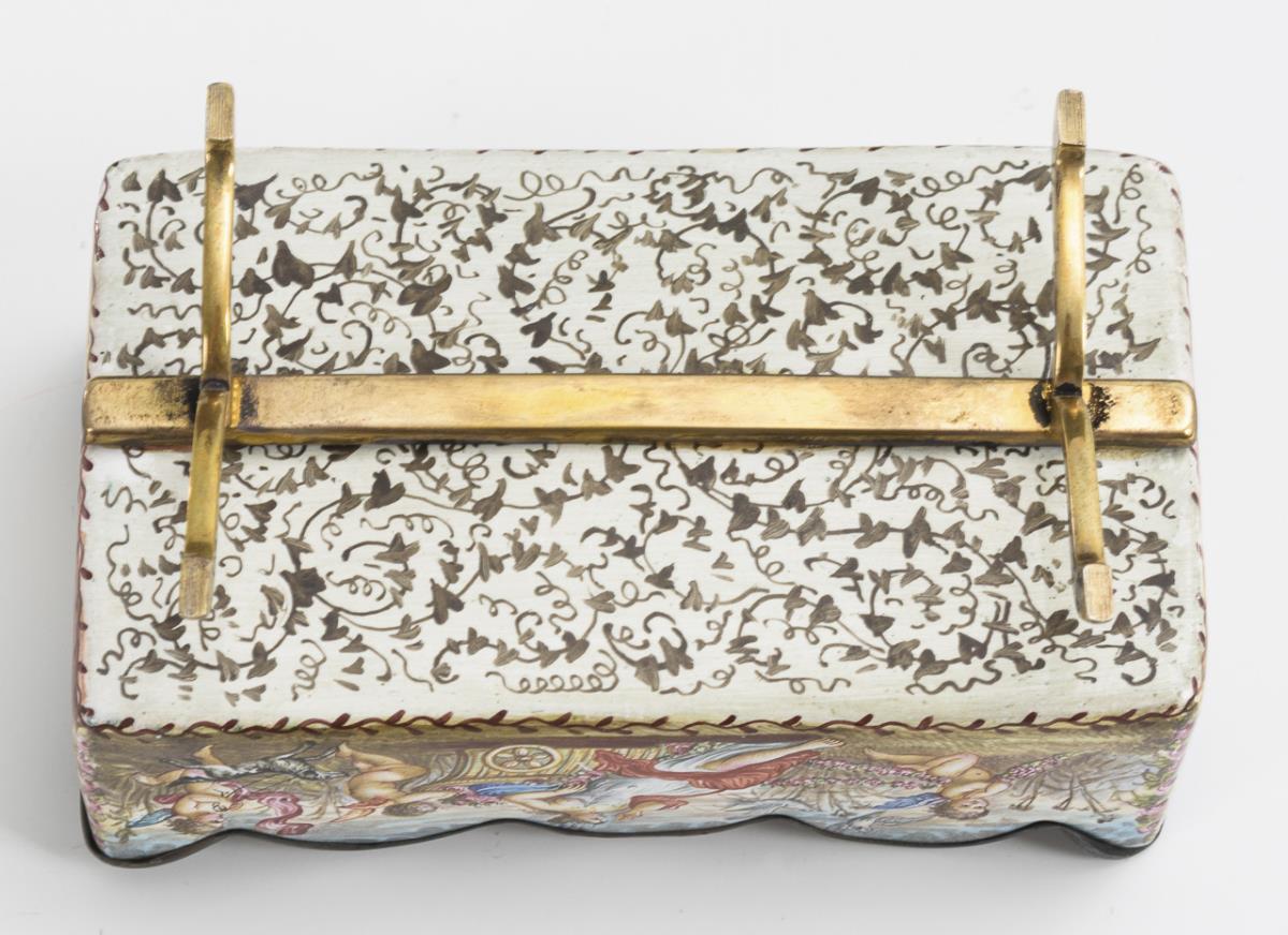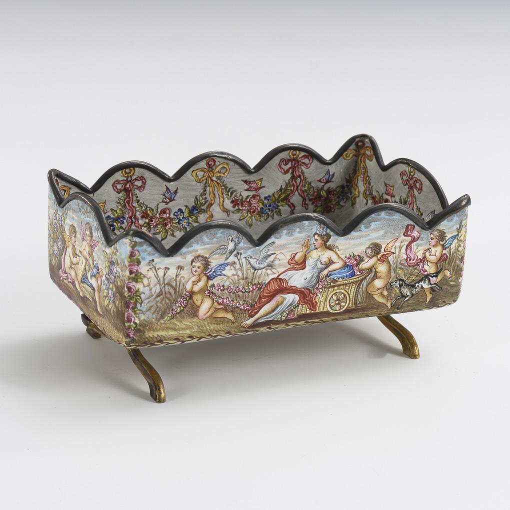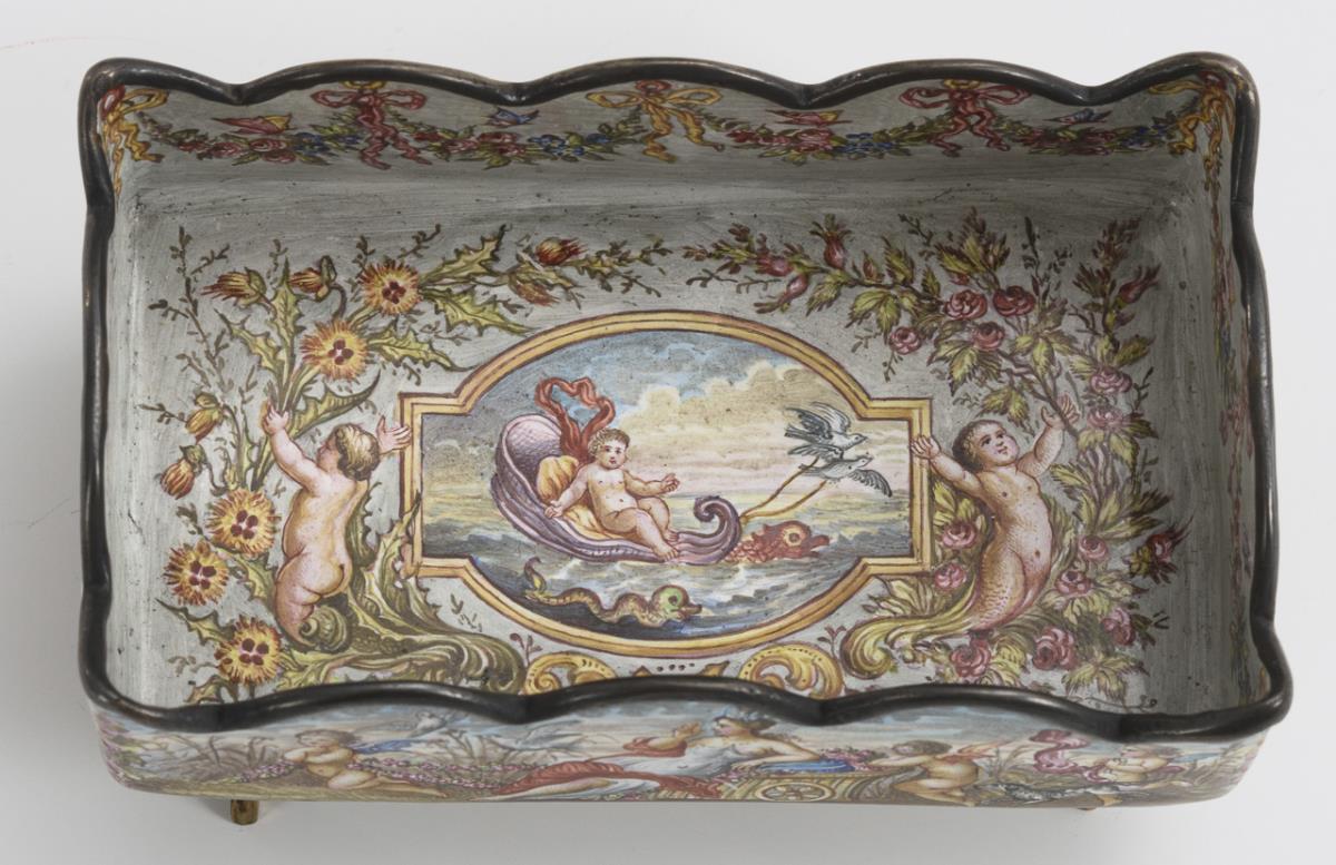 Box-shaped body resting on metal base with silver-trimmed scalloped rim. Fully covered with enamel painting: outside on the long sides Venus with putti, on the narrow sides putti with attributes of the arts. In the bottom lush floral ornament with putti and central cartouche with Cupid in the boat pulled by dolphins and doves. The interior walls are colorfully painted with floral vines, while the floor has thorn leaf vines in grisaille painting.