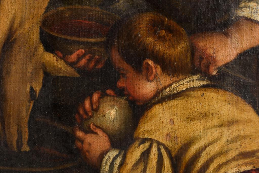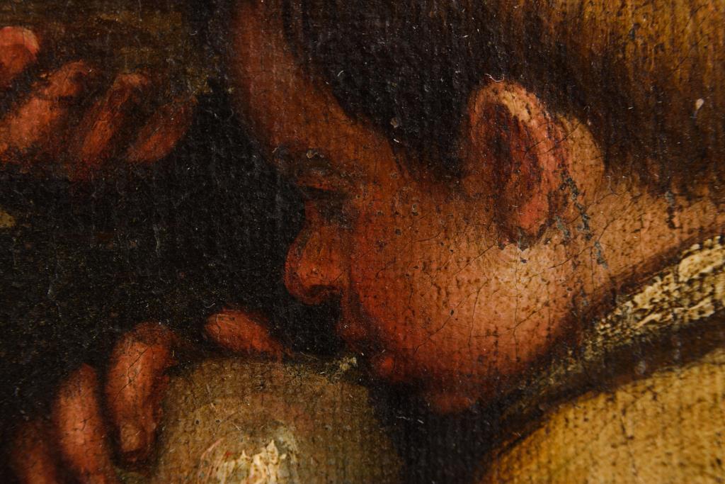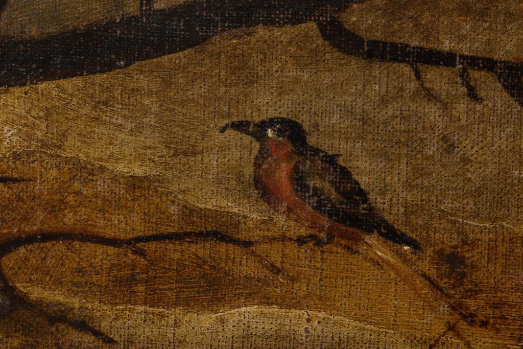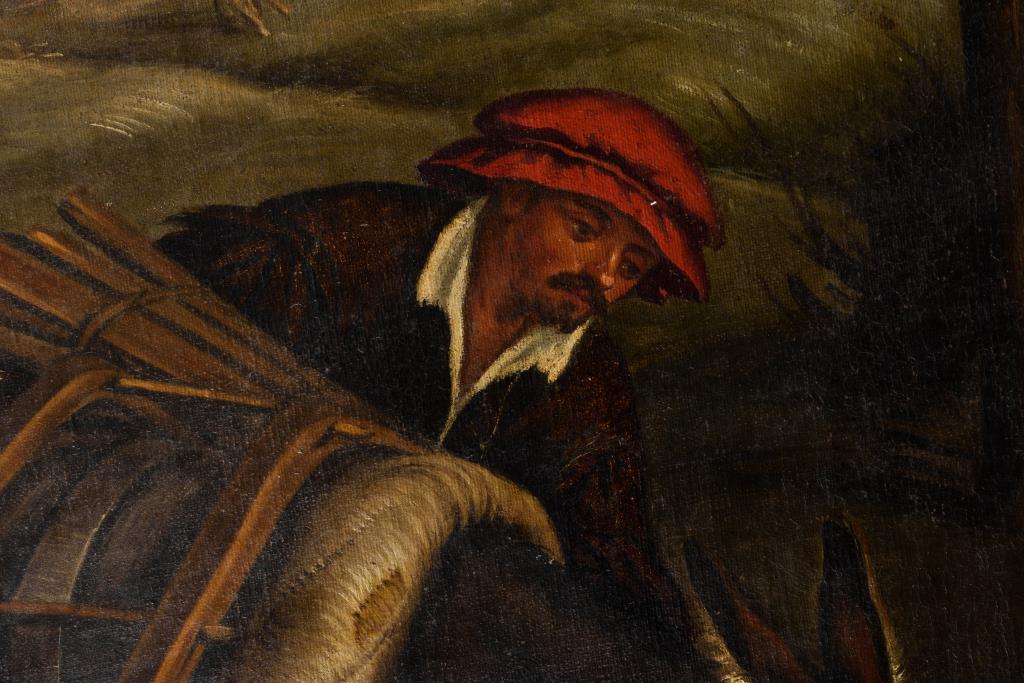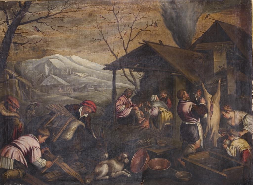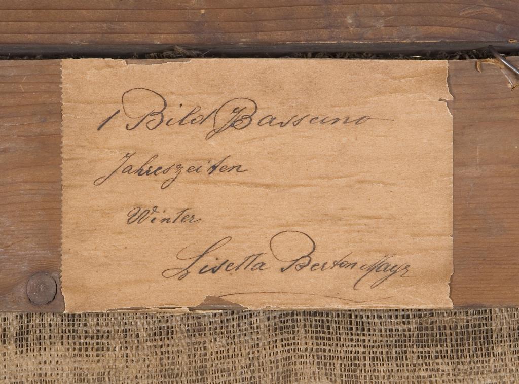 Aus dem Zyklus der durch Tätigkeiten der Bauern dargestellten 4 Jahreszeiten. Rückseitig auf Leinwand und Spannrahmen alte Besitzer-Klebezettel, teils mit Siegeln, von G. B. Berton und Lisetta Berton-Mayr. Rahmen. Verschiedene Varianten der 4 Jahreszeiten um 1575 und später gemalt befinden sich im Kunsthistorischen Museum in Wien und in der Galleria Borghese in Rom. Alt doubliert. Alter vergilbter Firnis.