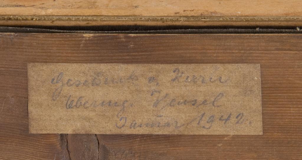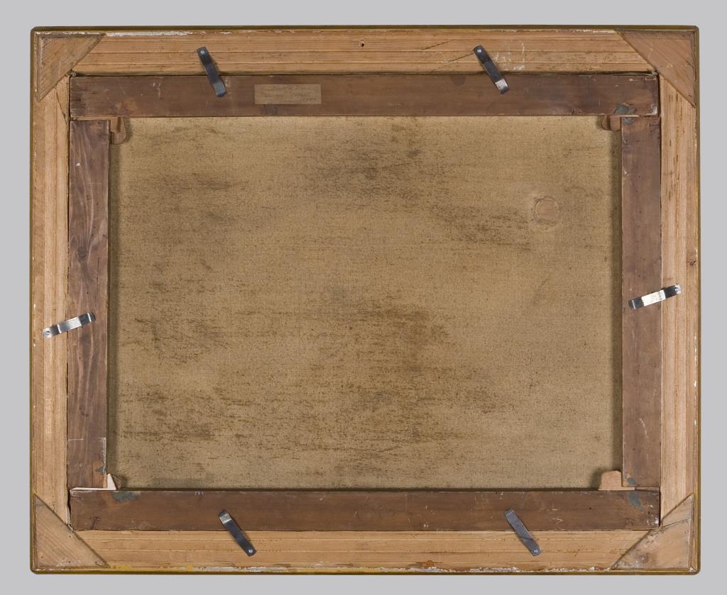 Originaler Keilrahmen mit altem Besitzer-Klebezettel von 1942. Profilierter Goldrahmen. Von hinten eine kleine Ecke restauriert.