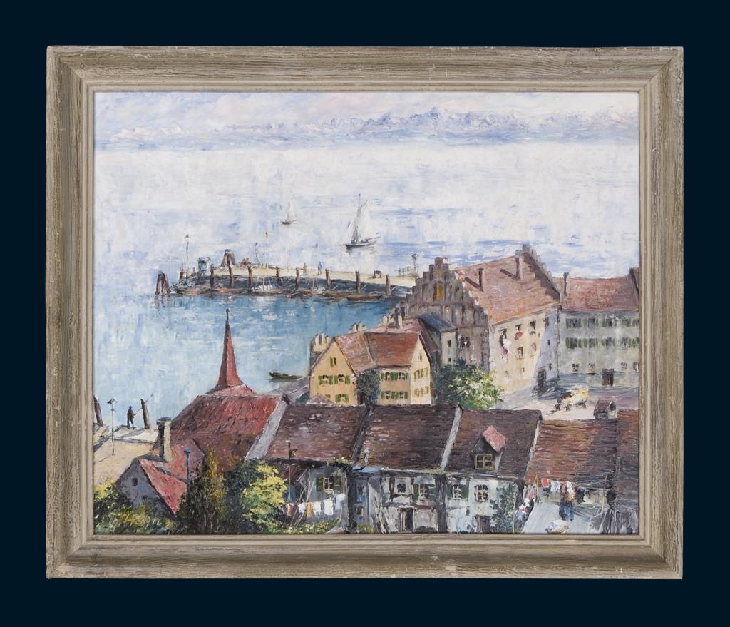 Im Hintergrund das Alpen-Panorama. Profilierter Rahmen.