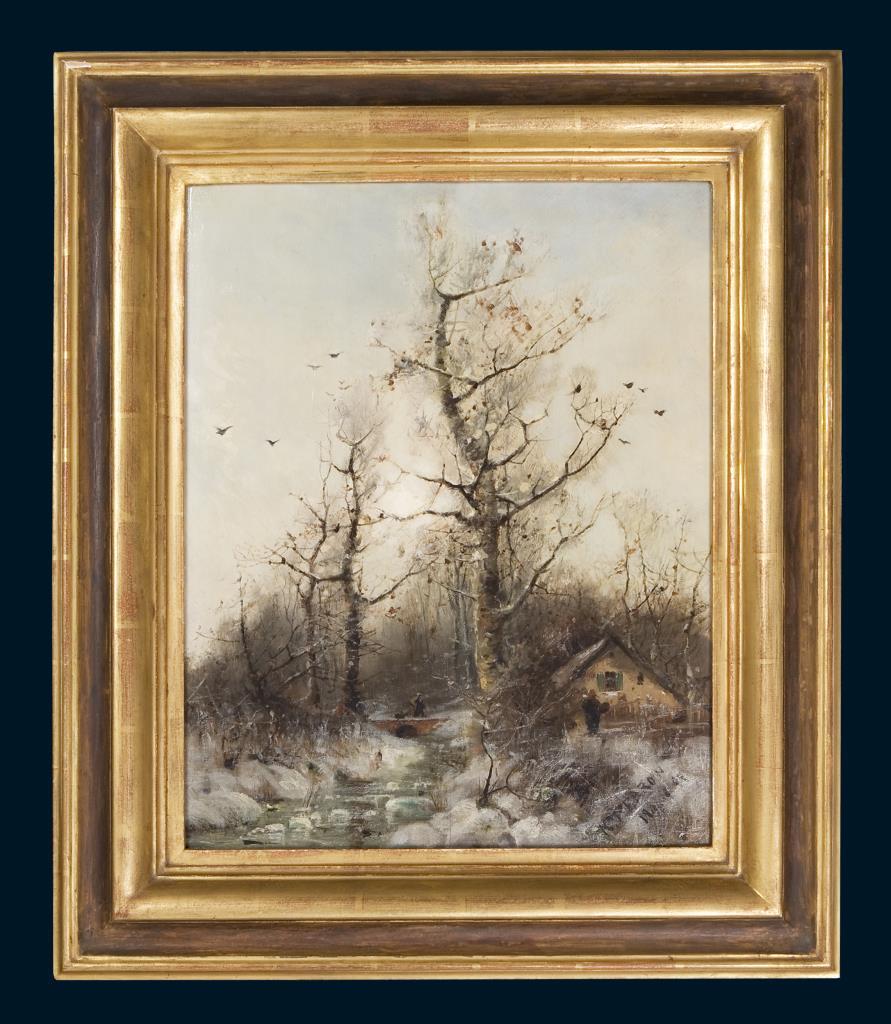 Im Wald von Fontainbleau. Sogenannte Paysage intime. Schule von Barbizon, Nachfolge. Profilierter Rahmen, partiell vergoldet. Rahmen partiell leicht defekt.