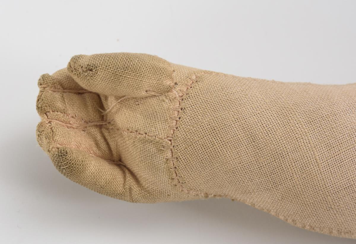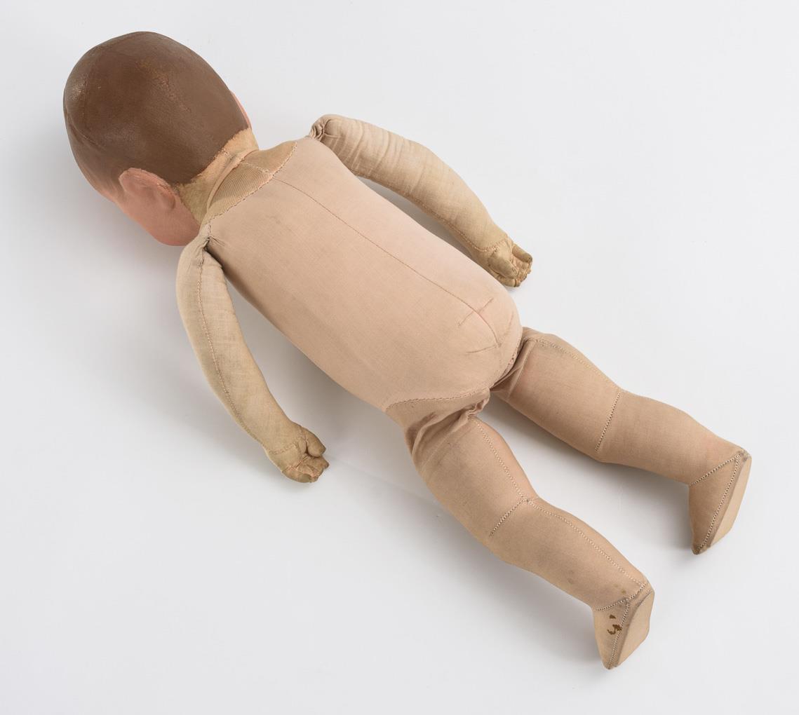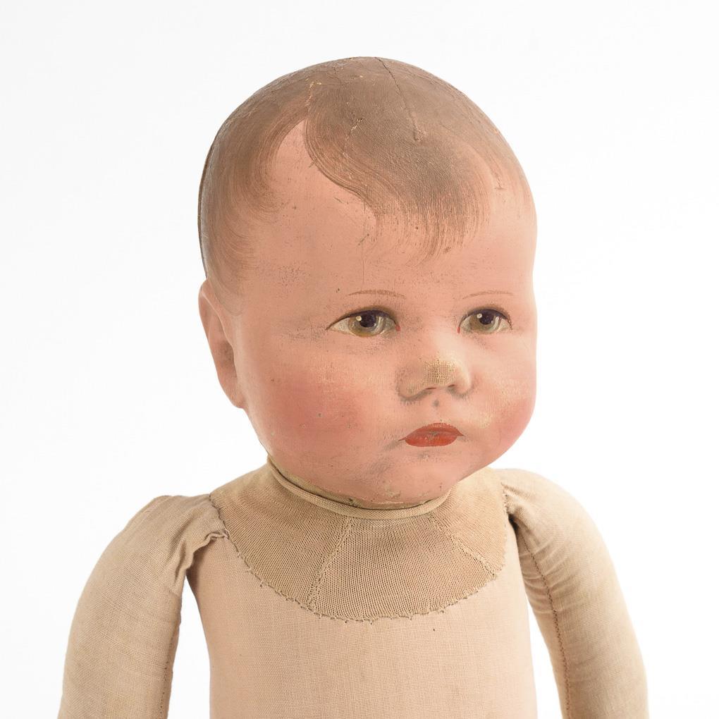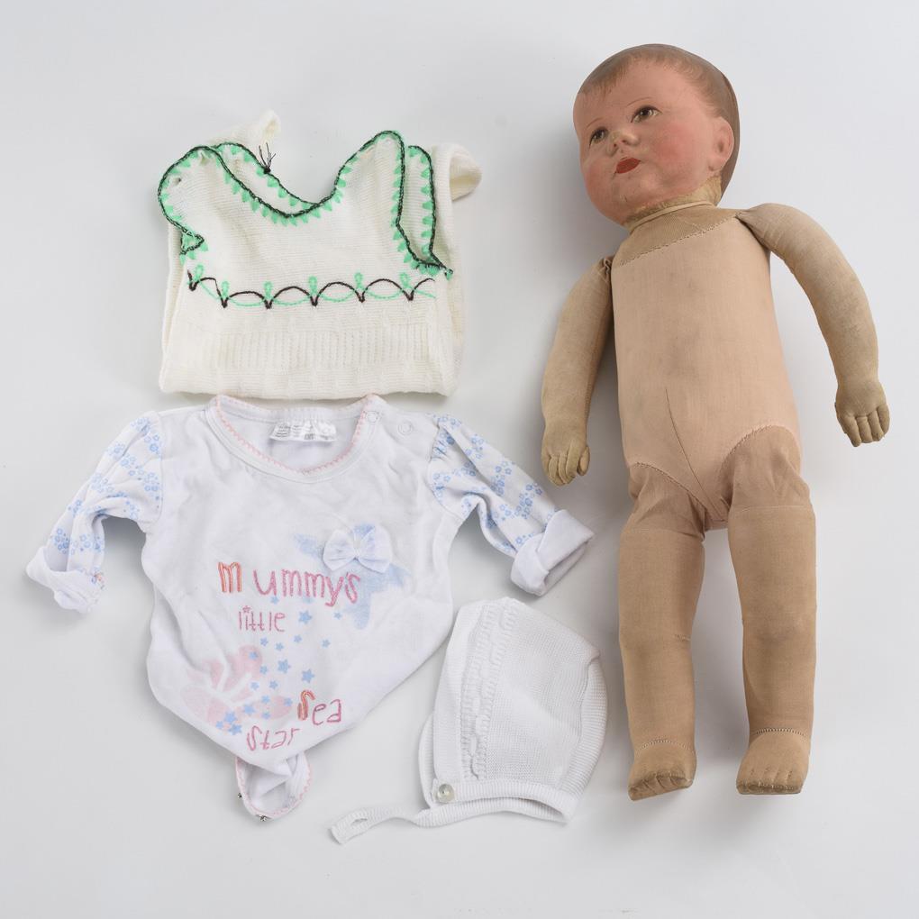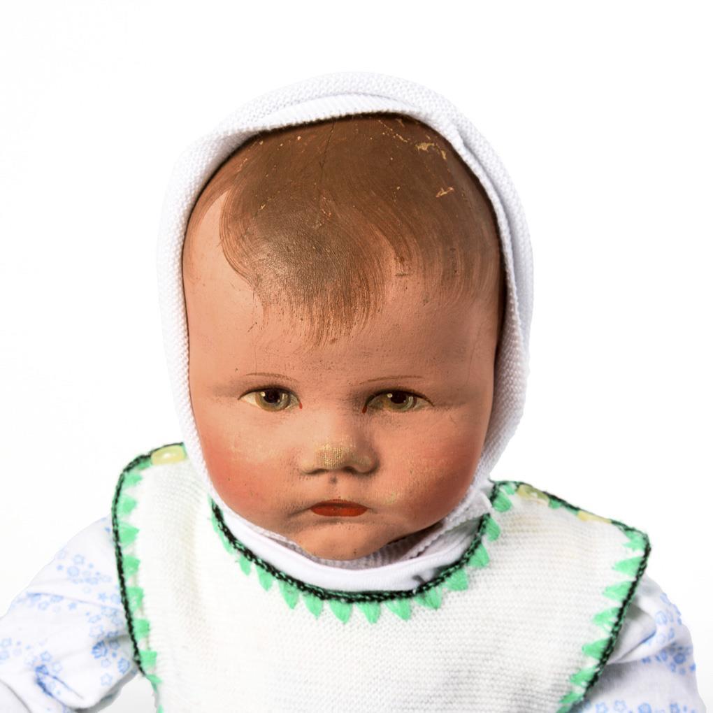 Jersey head with a back seam and Röllchen at the neck. Cloth body with looping links and stitched fingers and toes. In addition jünger ergänzte baby clothes. Played with, head probably repainted in the 1950s.