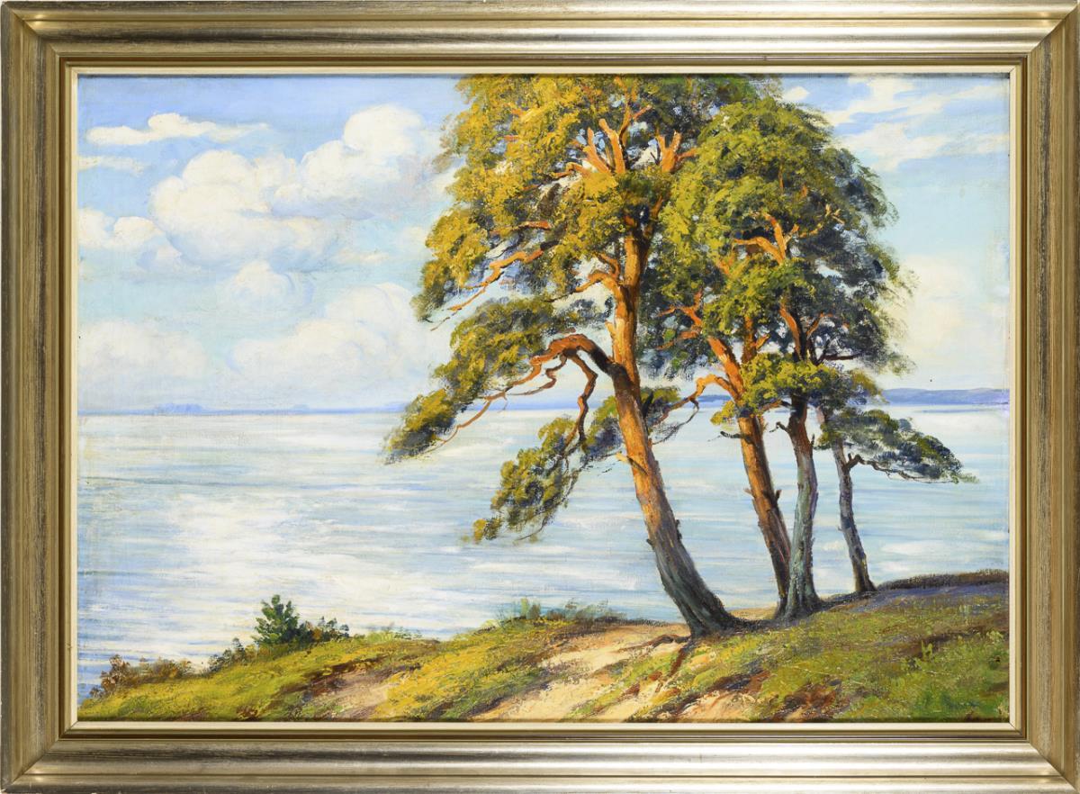 Sunshine over the coast with the trees above the water and view over the sea. A defect at the edge.