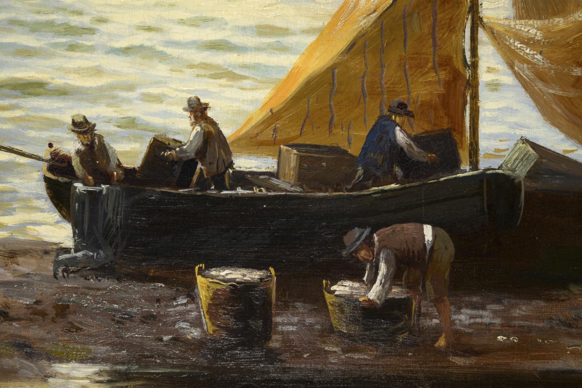 The fishermen with the catch on the beach near the houses on the mountain in the sunshine.