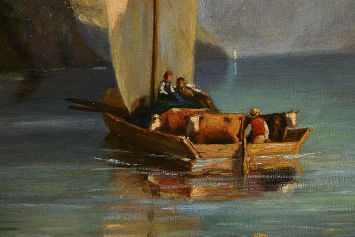 Sailor with farmers and cattle in the warm sunshine on the lake under a blue sky. Traces of age.