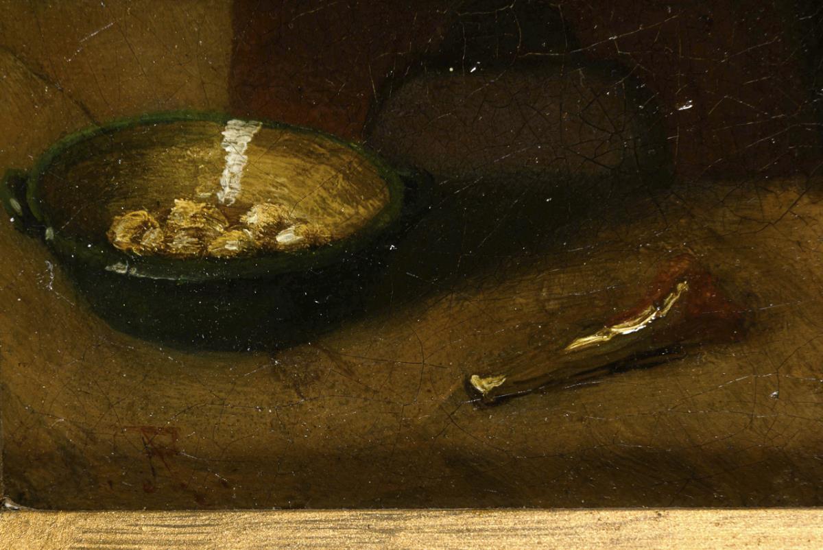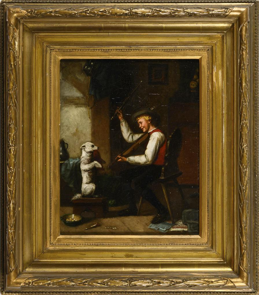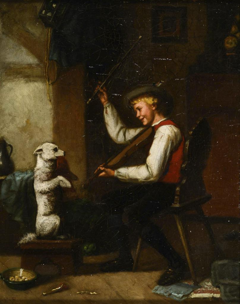 The boy playing music with the violin in front of the dog making man with a cloth in his mouth. A small restored spot.