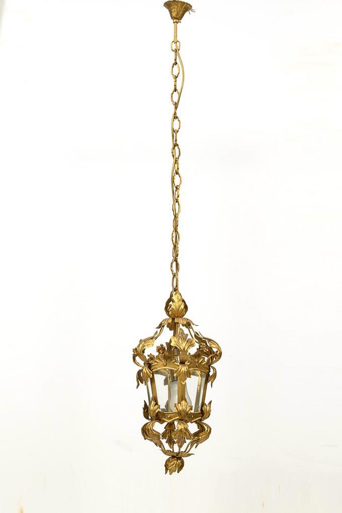 1-light ceiling lantern on chain suspension with palmette canopy, 6-paneled body with lush acanthus leaf decor. Metal with traces of corrosion.