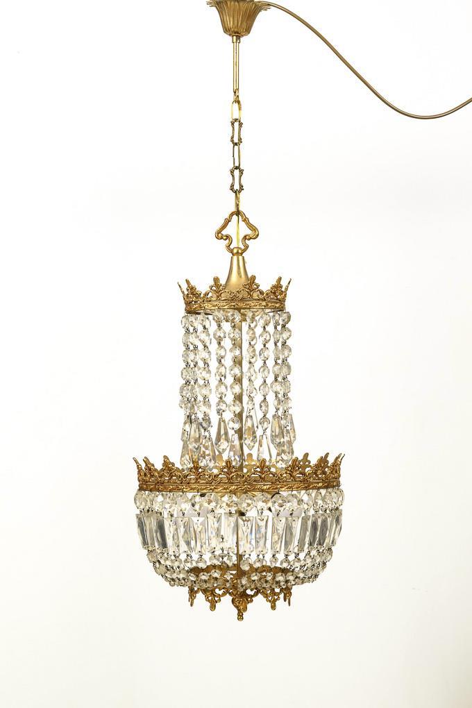 4-light, teardrop-shaped hanging lamp with rich prismatic hanging on brass frame with antique relief decoration and palmette canopy. Metal with slight traces of corrosion.