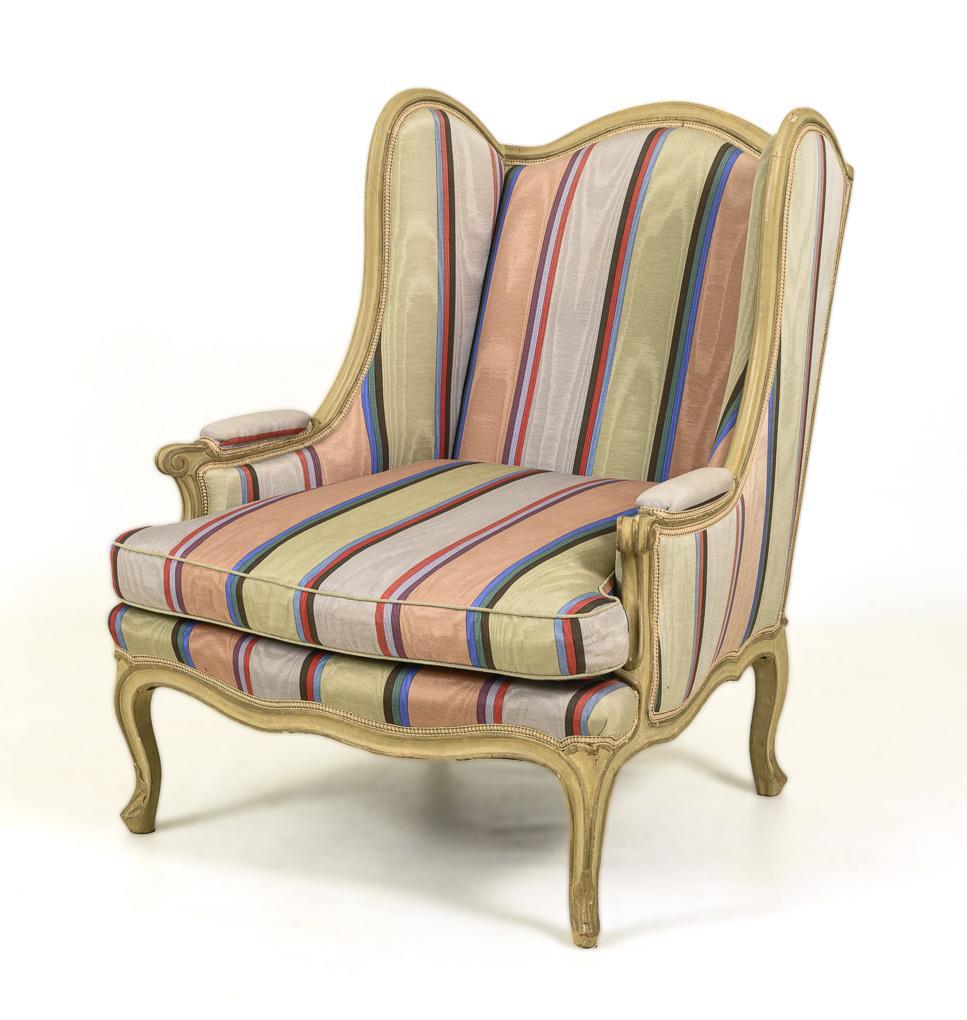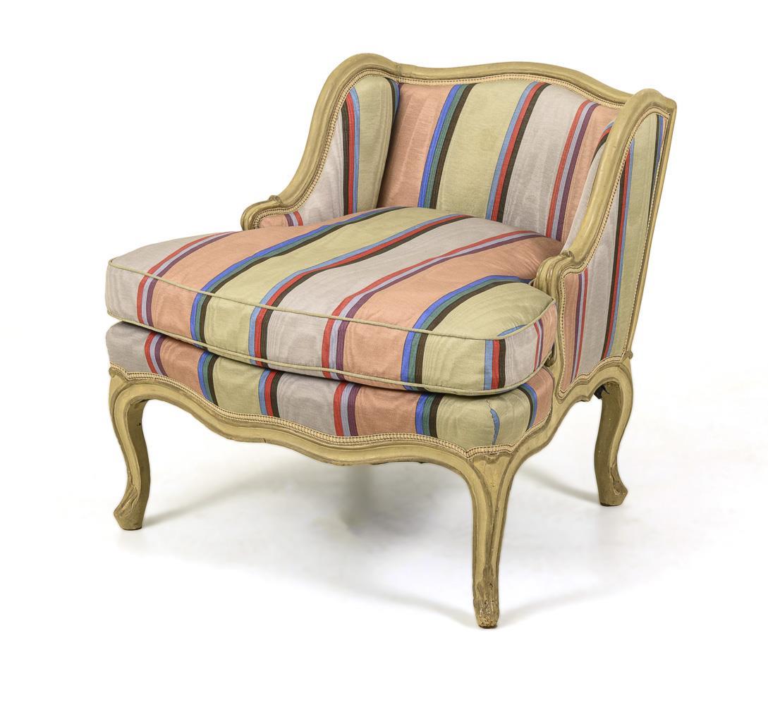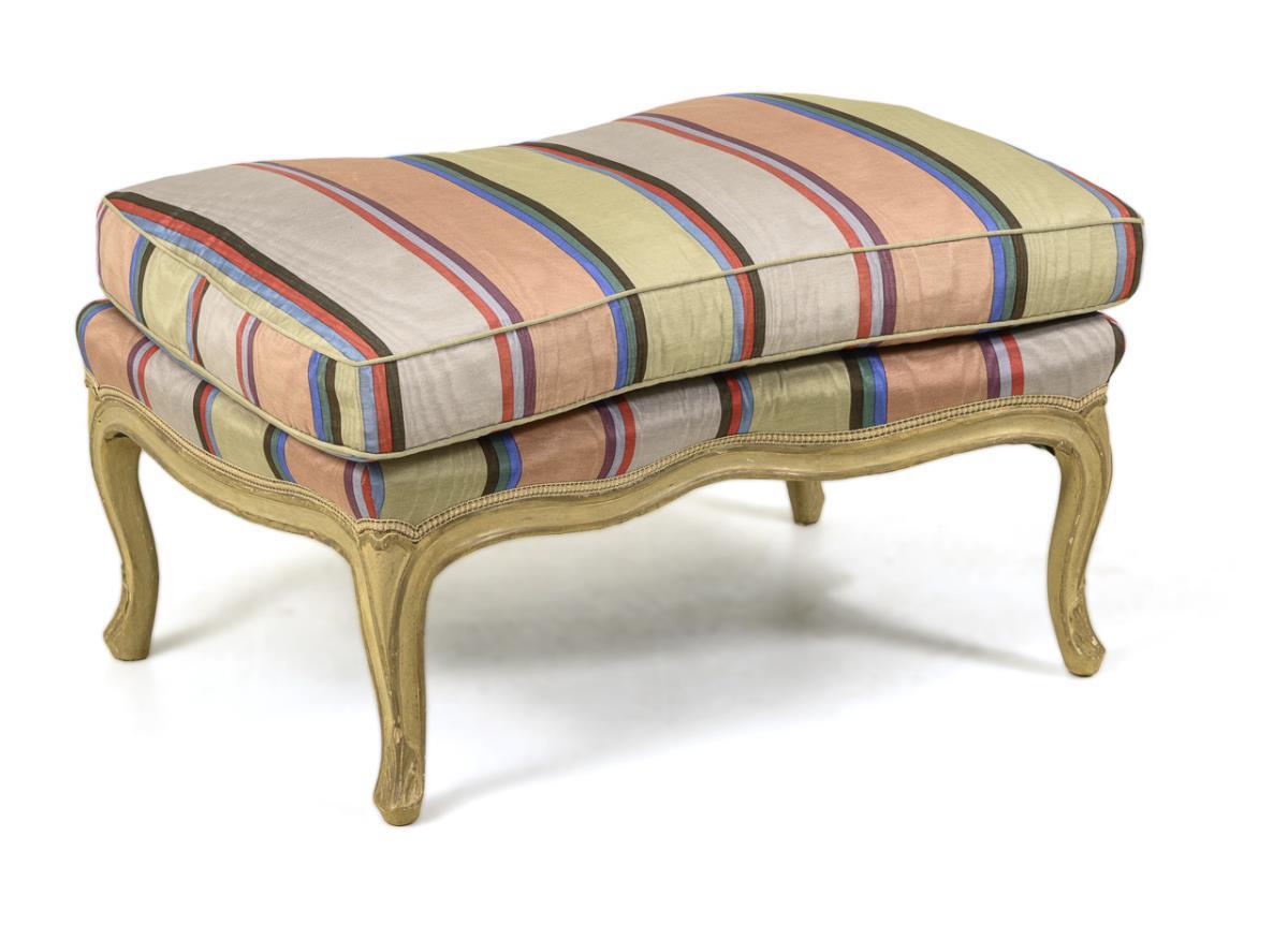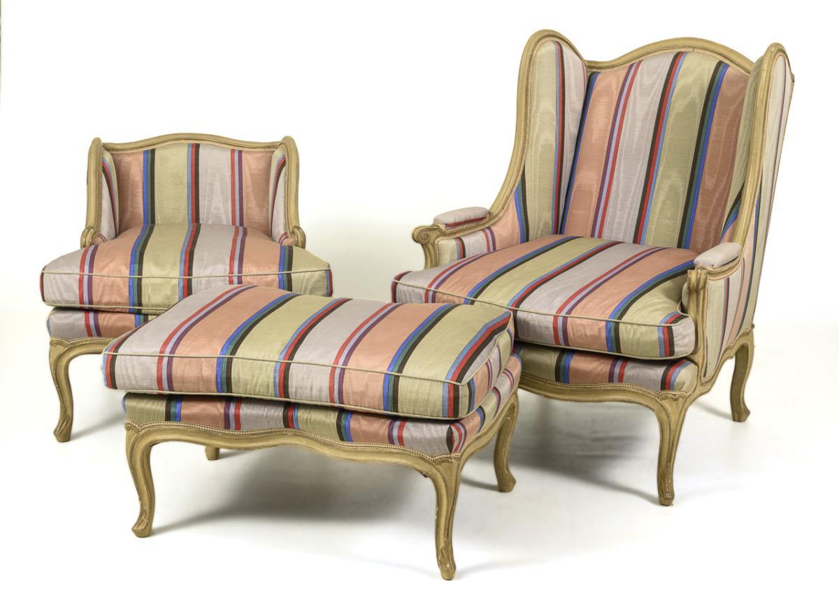 3-piece, curved seat set in baroque style, which can be assembled into a couch ("chaise longue"). Consisting of fully upholstered ladies and men's armchair and stool, extravagant cover with colorful stripes; total length: approx 205 cm, Sitzhöhe ca. 46 cm. Traces of age / use, striped cover probably from the 1980s, somewhat stained.