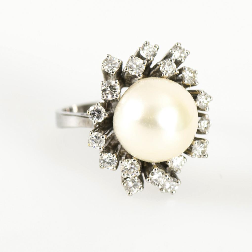 Large cultured pearl surrounded by 18 chaton set diamonds, between narrow rail.
