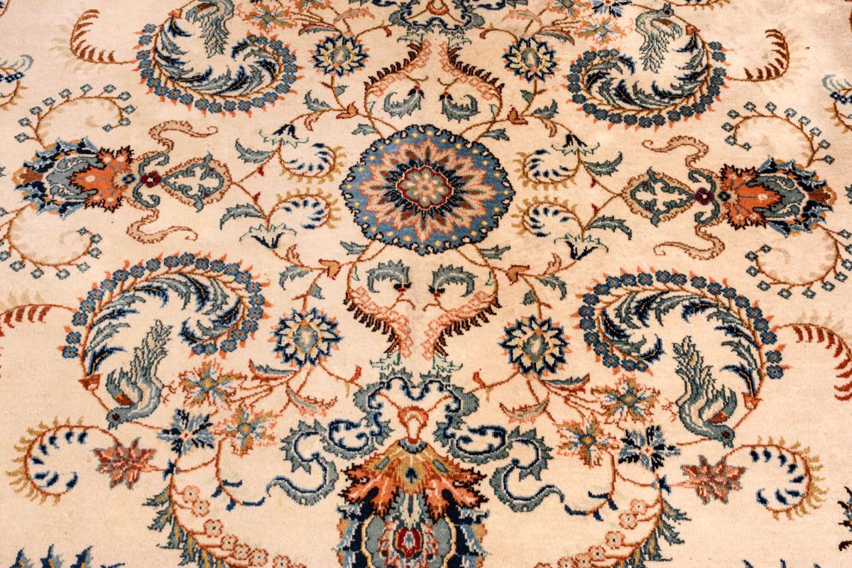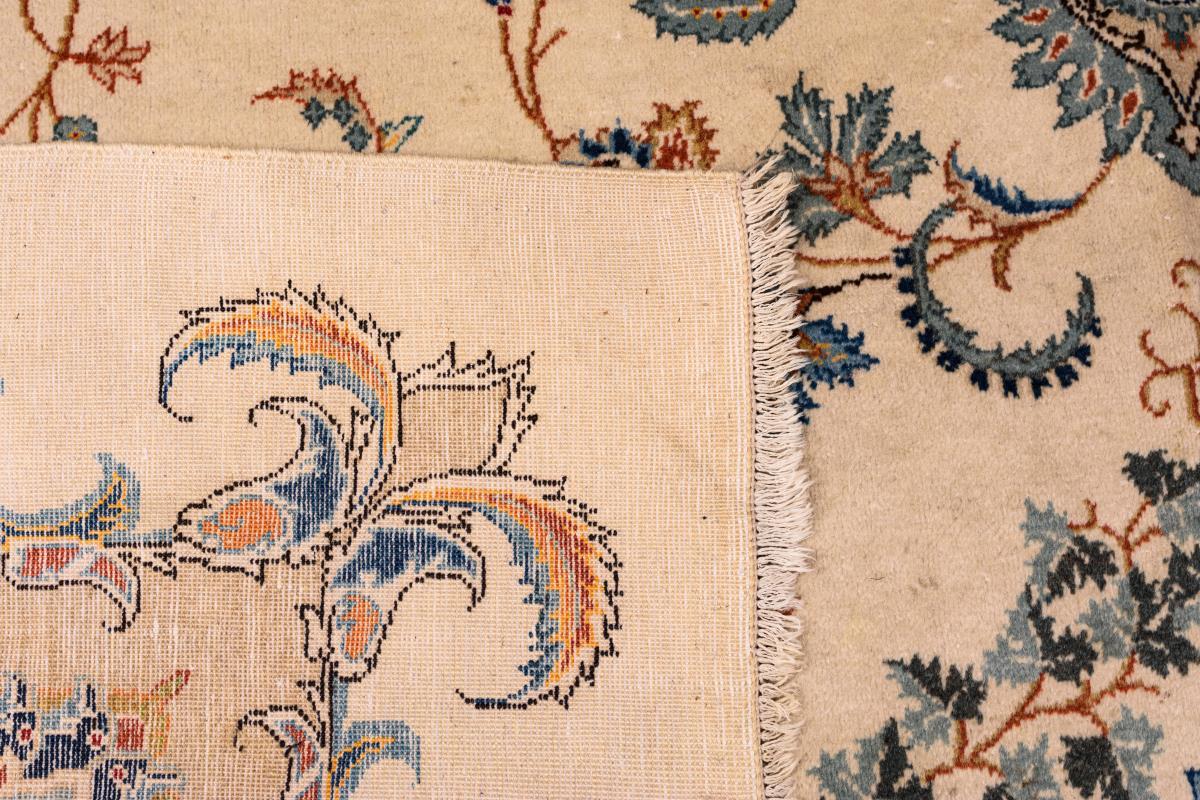 Wolle und Baumwolle, handgeknüpft. Vorwiegend Cremefarben und Blau mit dezentem Farbspiel.