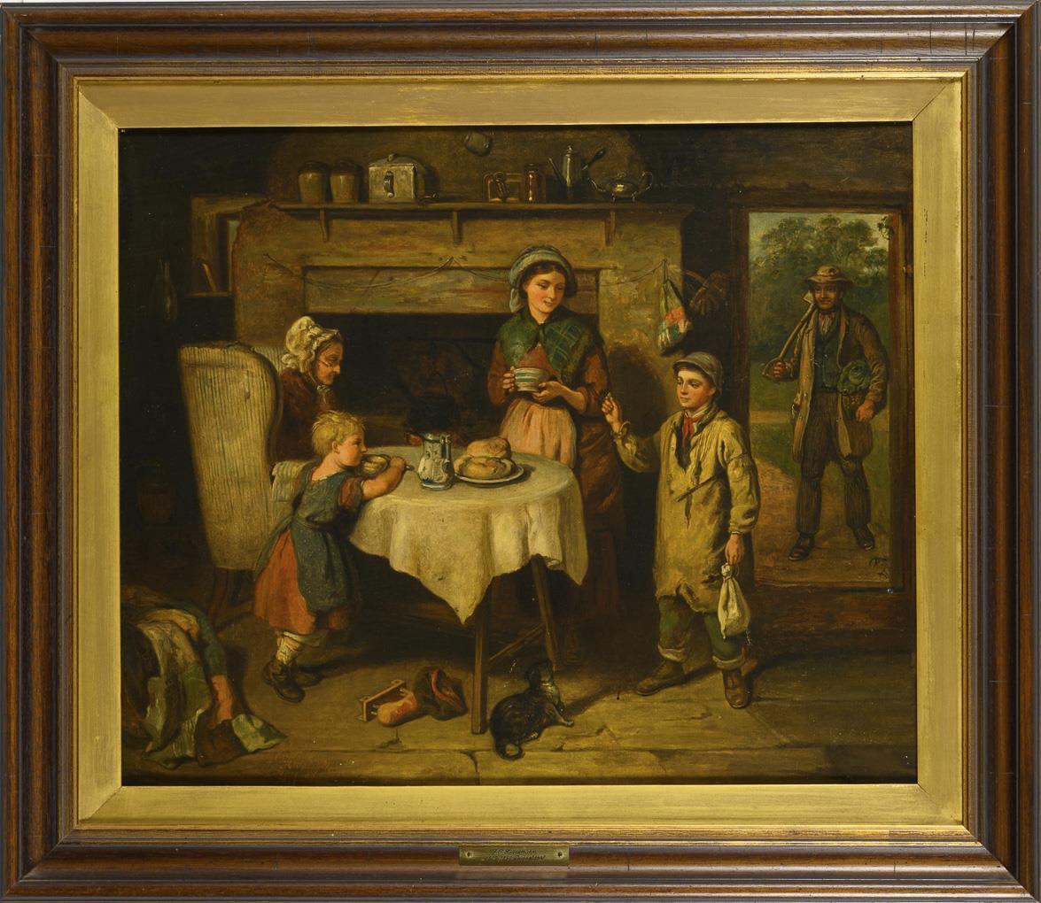 The mother with the children and the grandmother in the table in the parlor, while the farmer approaches from outside. Slight signs of age.
