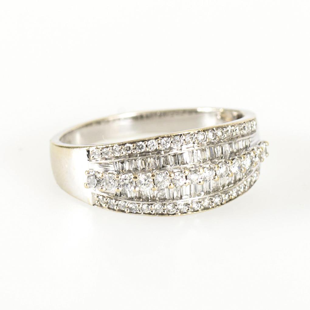 Band ring with 47 inset brilliant-cut diamonds and 40 baguette diamonds. Wide gradient rail.