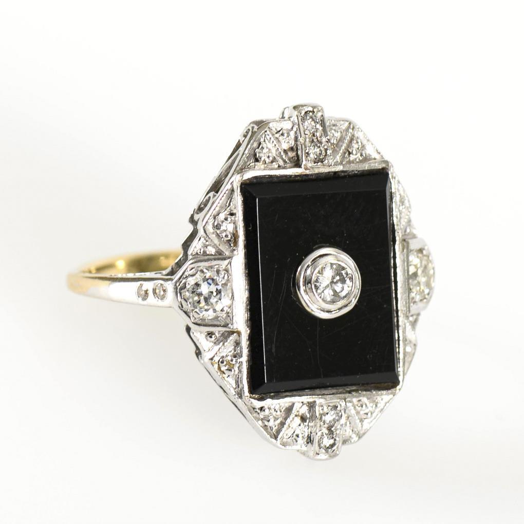 Relief ring head with bezel-set onyx plaque, 9 small brilliant-cut diamonds and 2 diamonds, between narrow rail.
