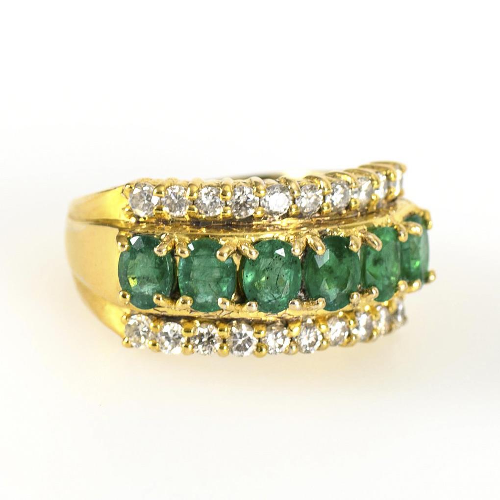 6 claw-set emeralds and 20 inset brilliant-cut diamonds, between wide gradient rail.