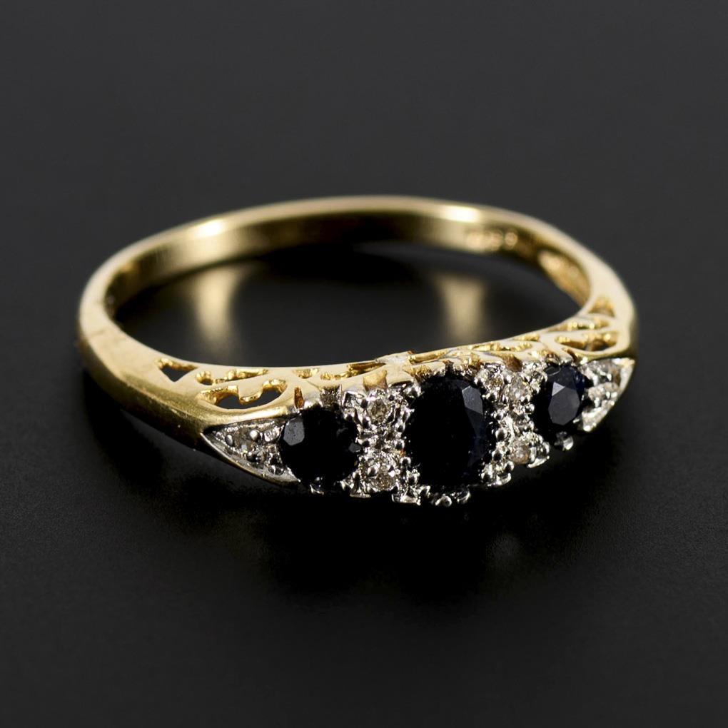 3 inset sapphires and 6 small diamonds, between narrow rail.