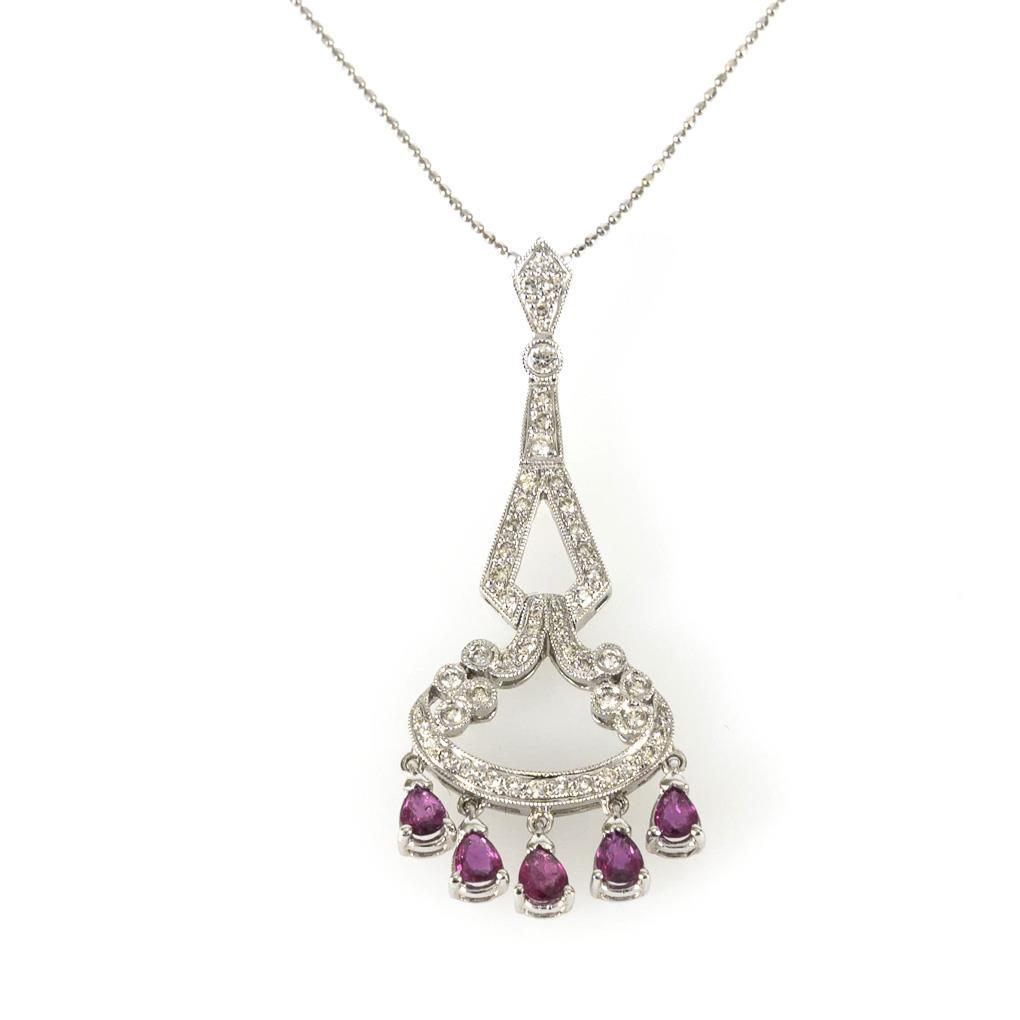 Millegriffes pendant with 54 small inset diamonds and 5 suspended ruby drops. Ornamental link chain with ring spring clasp.