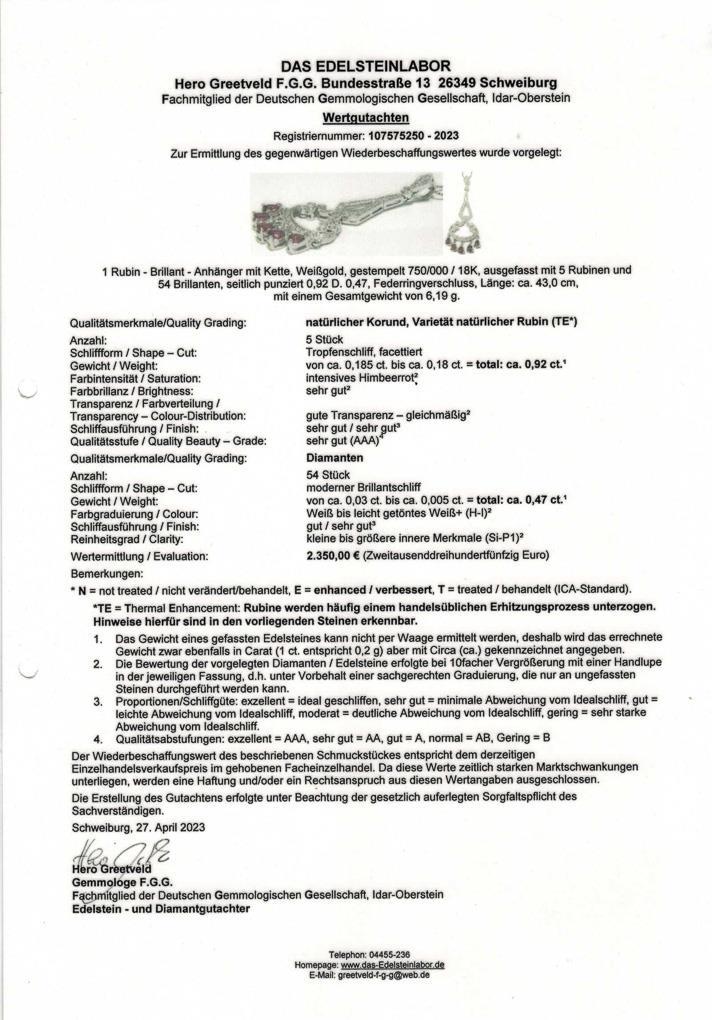 White gold 750 stamped. Diamonds together approx. 0.47 ct/H-I/si-PI. Rubies zus. ca. 0,92 ct/intensive raspberry red. Pendant 4,5 x 2 cm. Chain L 43 cm. 6,1 g.