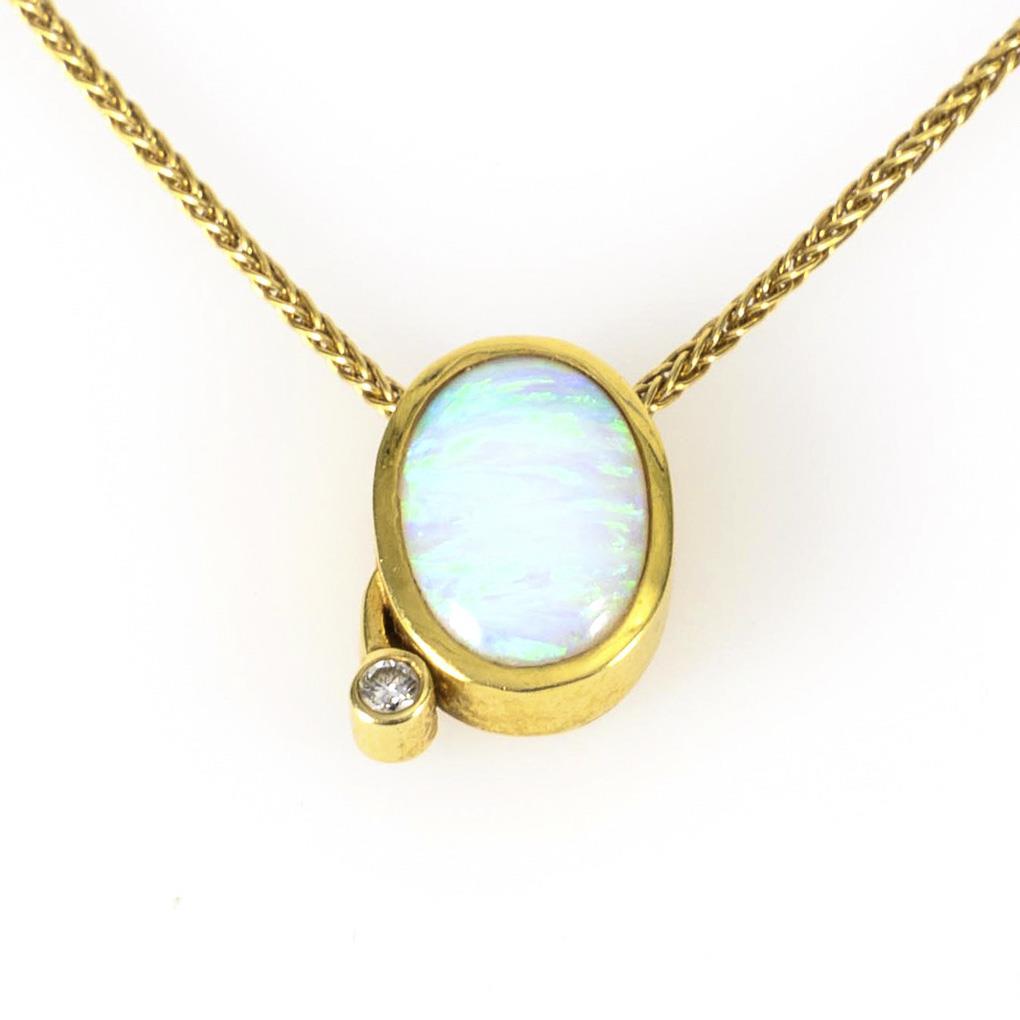 Modern pendant with opal and diamond on chain.