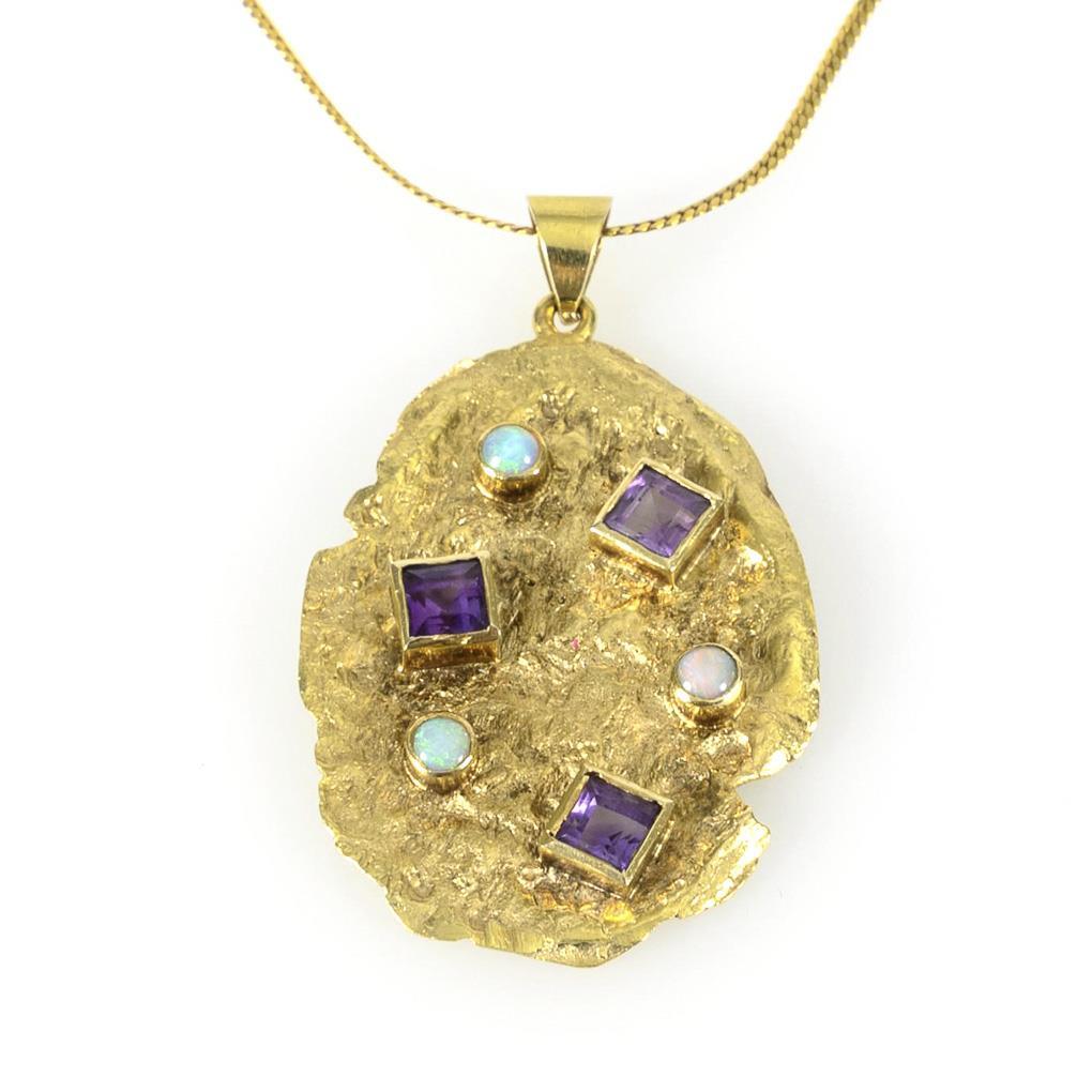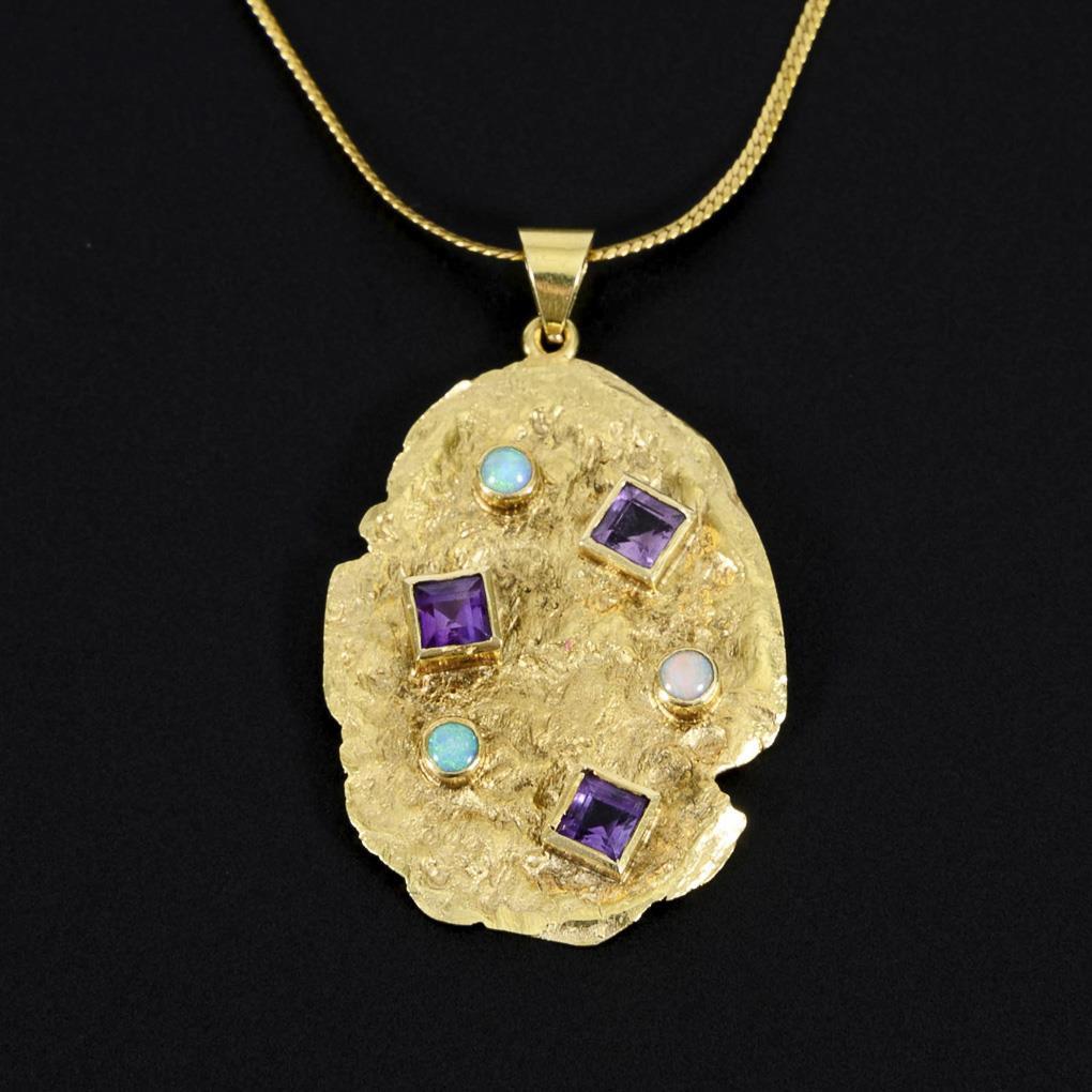 Textured plate with 3 casket-set amethysts and 3 opalcabochons, on flat curb chain with ring spring clasp.