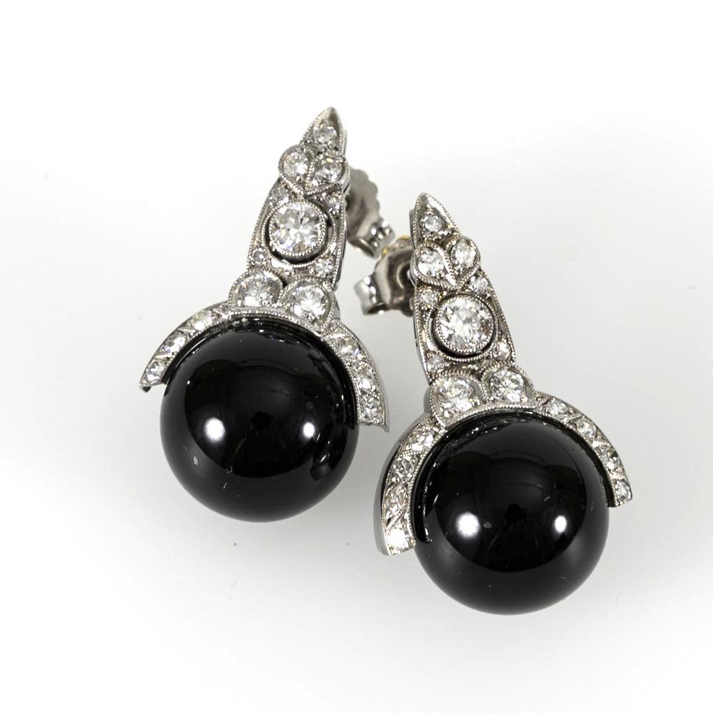 Art deco stud earrings pair with onyx, diamonds.