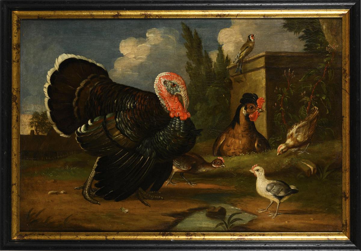 Chickens with turkey and bird in the sunshine near the house. Traces of age.