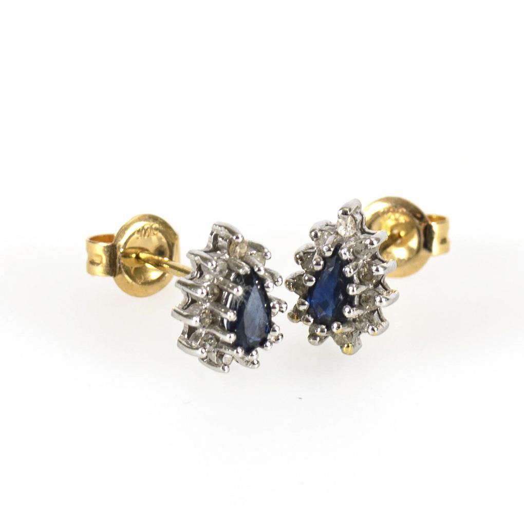 Small sapphire surrounded by 11 small diamonds each. Plug-in mechanism.