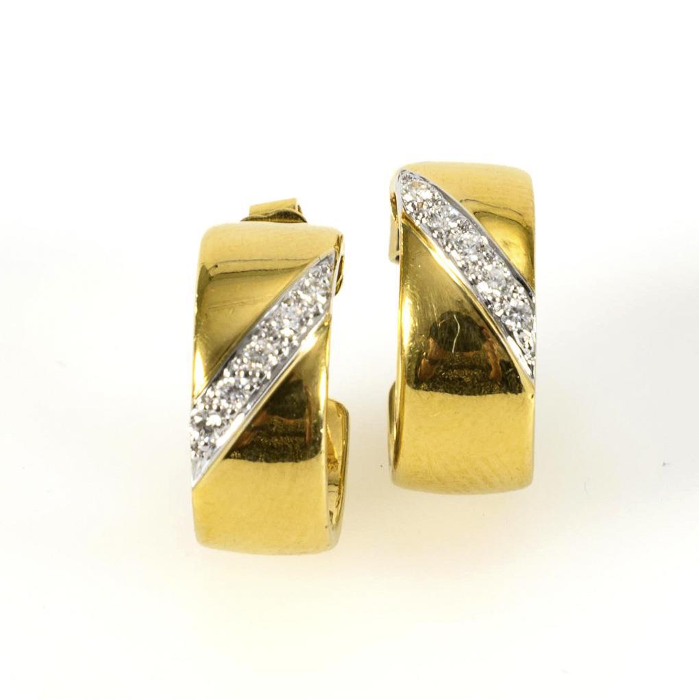 Yellow gold 750 stamped. Diamonds total approx. 0.10 ct. Creole Ø 13 cm. Width 6 cm. 9,2 g.