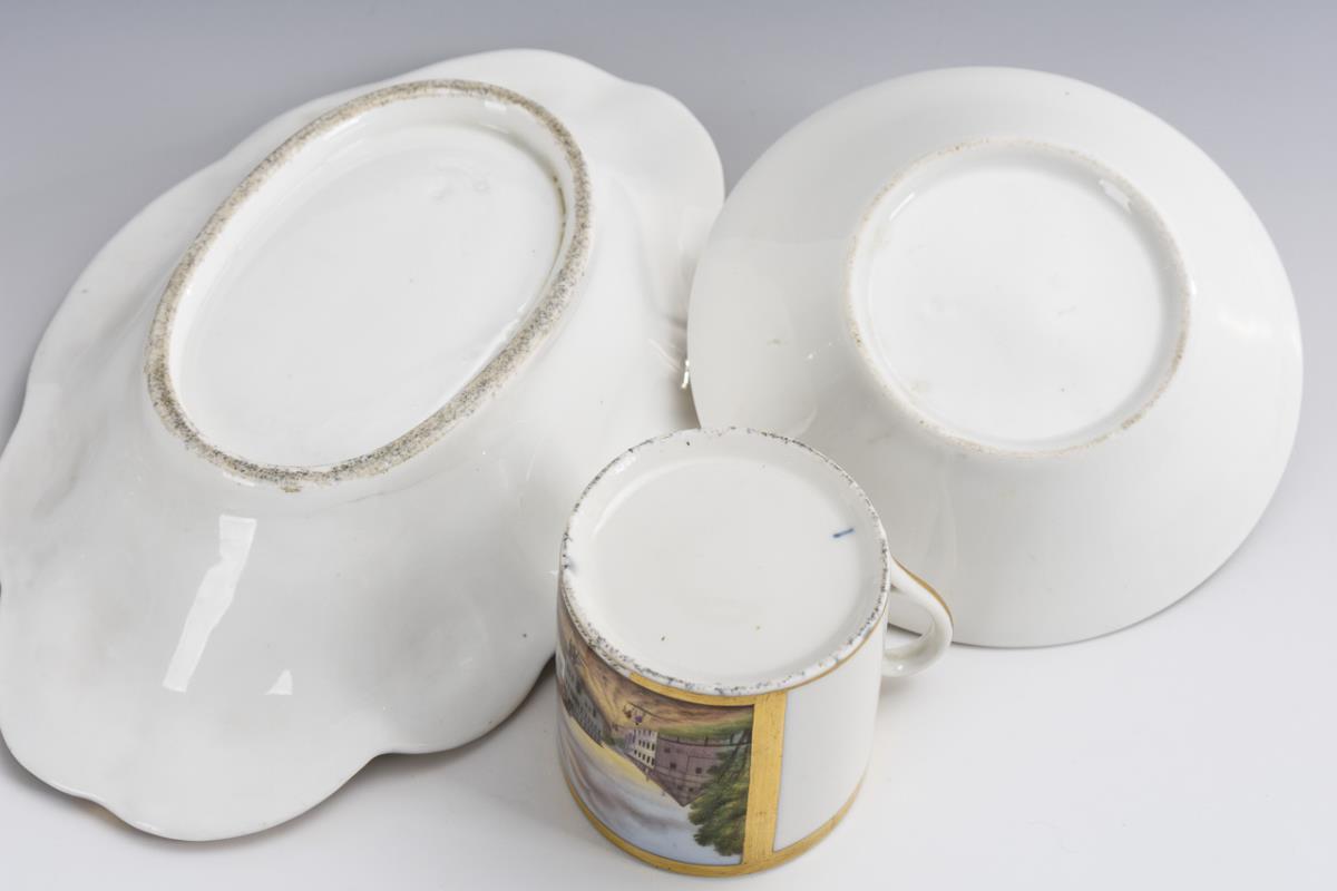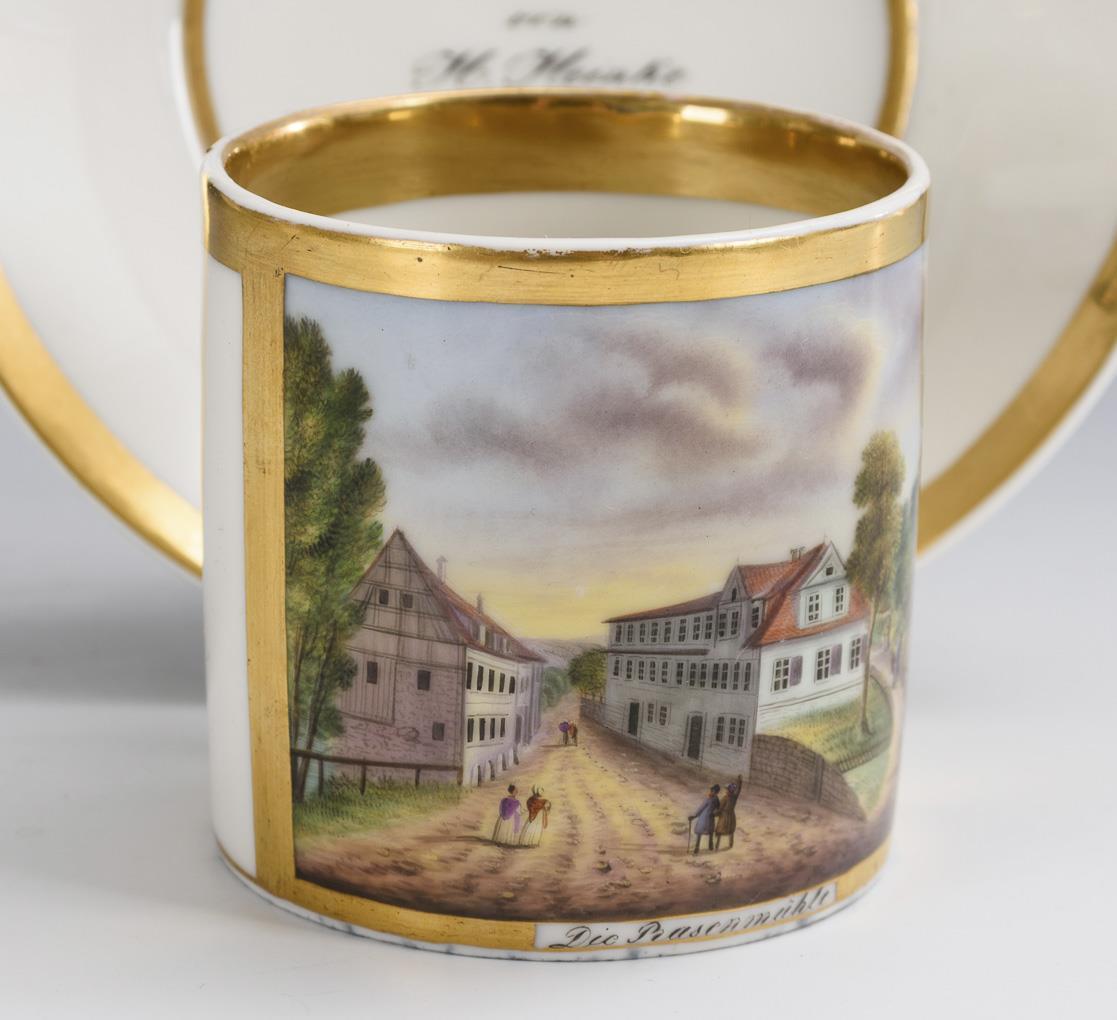 1x unmarked, circa 1840th: cylindrical cup with ear handle and the view of a street on the front, inscribed "Basenmühle" (sic!), in the mirror of the saucer the dedication "d. 28 juni 1841. by H. Heinke". / 1x GOTHA, c. 1883: oval bowl, in the mirror the view of the Hotel Müller - Sanatorim Charlotte in Bad Liebenstein. Dish gold rubbed.