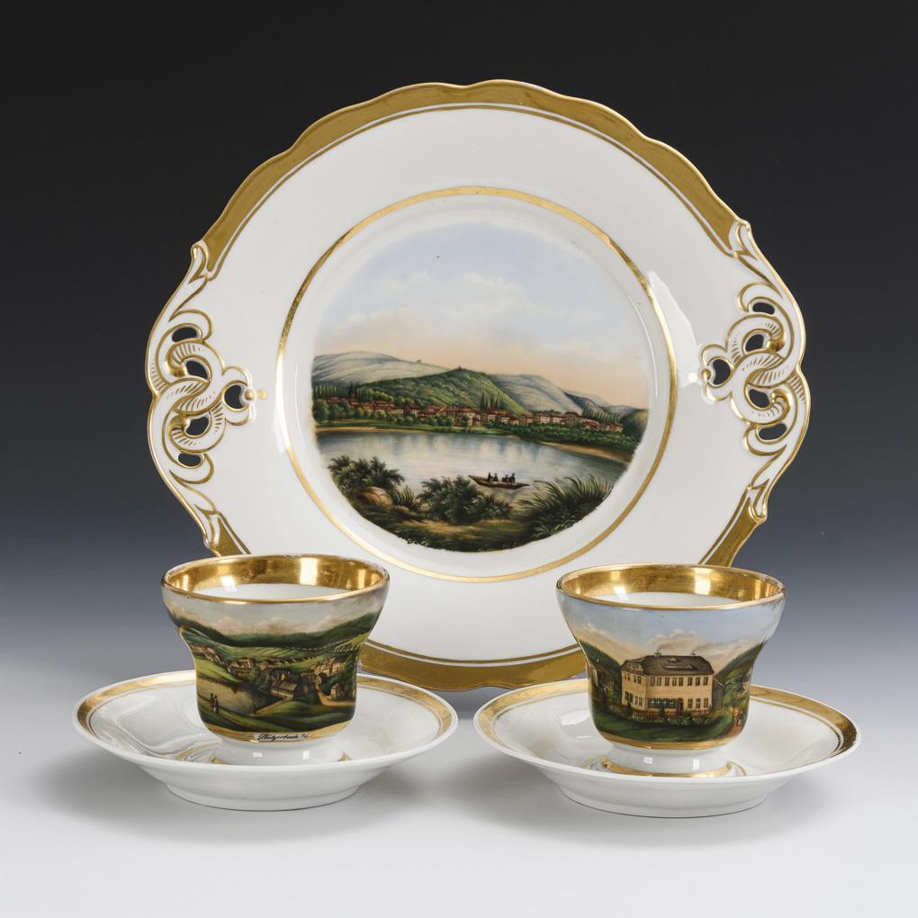 2 footed bell cups with rocaille fennel, on the outside of each a gold-framed rectangular cartouche with a Thuringian view (of which 1x Stützerbach). / 1 credenza plate with the view of a village in mountainous landscape with lake. Partially gold somewhat rubbed.
