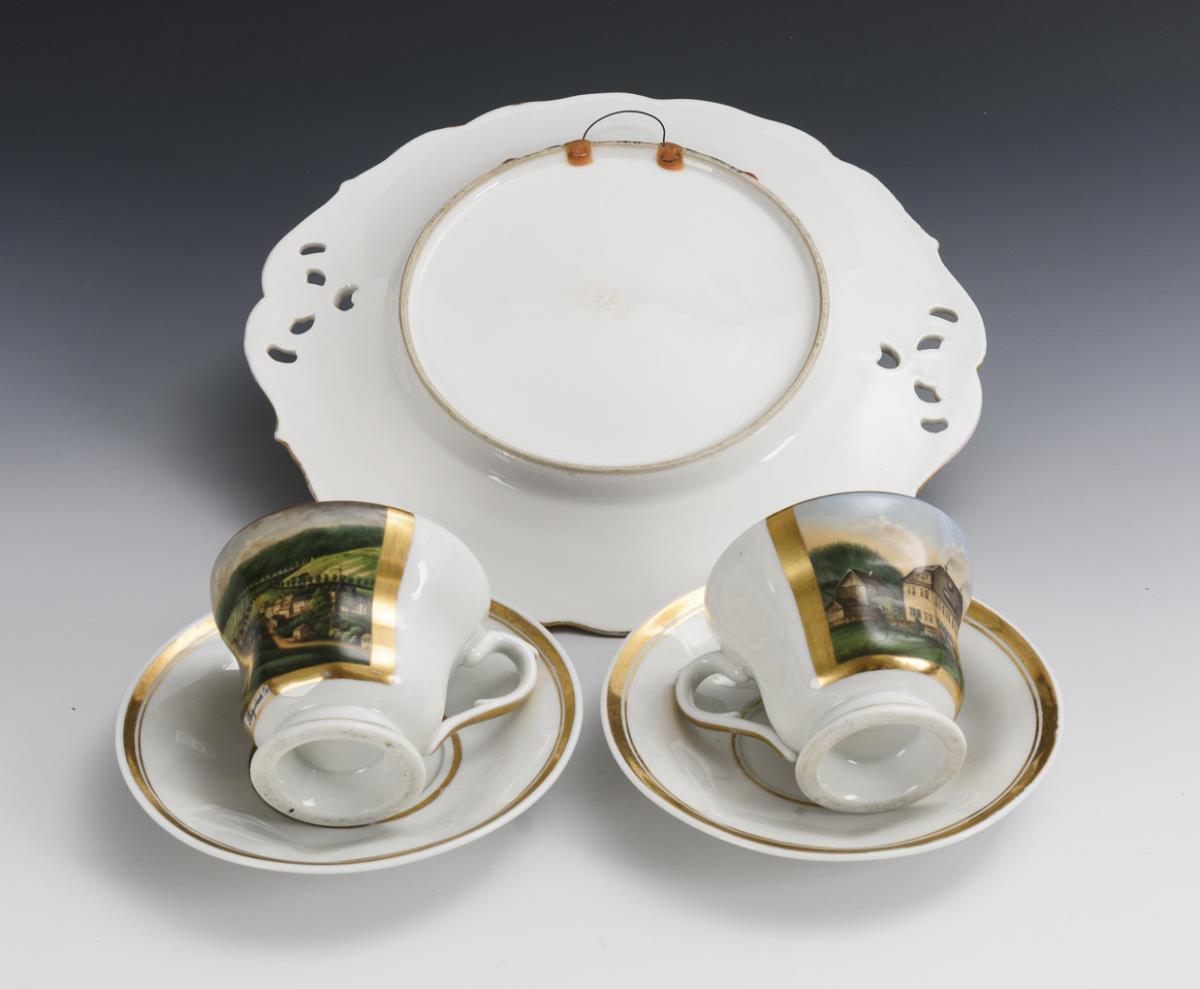 2 footed bell cups with rocaille fennel, on the outside of each a gold-framed rectangular cartouche with a Thuringian view (of which 1x Stützerbach). / 1 credenza plate with the view of a village in mountainous landscape with lake. Partially gold somewhat rubbed.