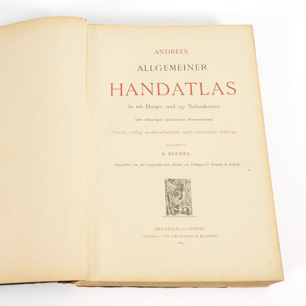 4th completely revised and increased edition. Publisher A. Scobel. 126 major and 137 minor maps, in half leather binding with gold embossing. Signs of use, spine torn.