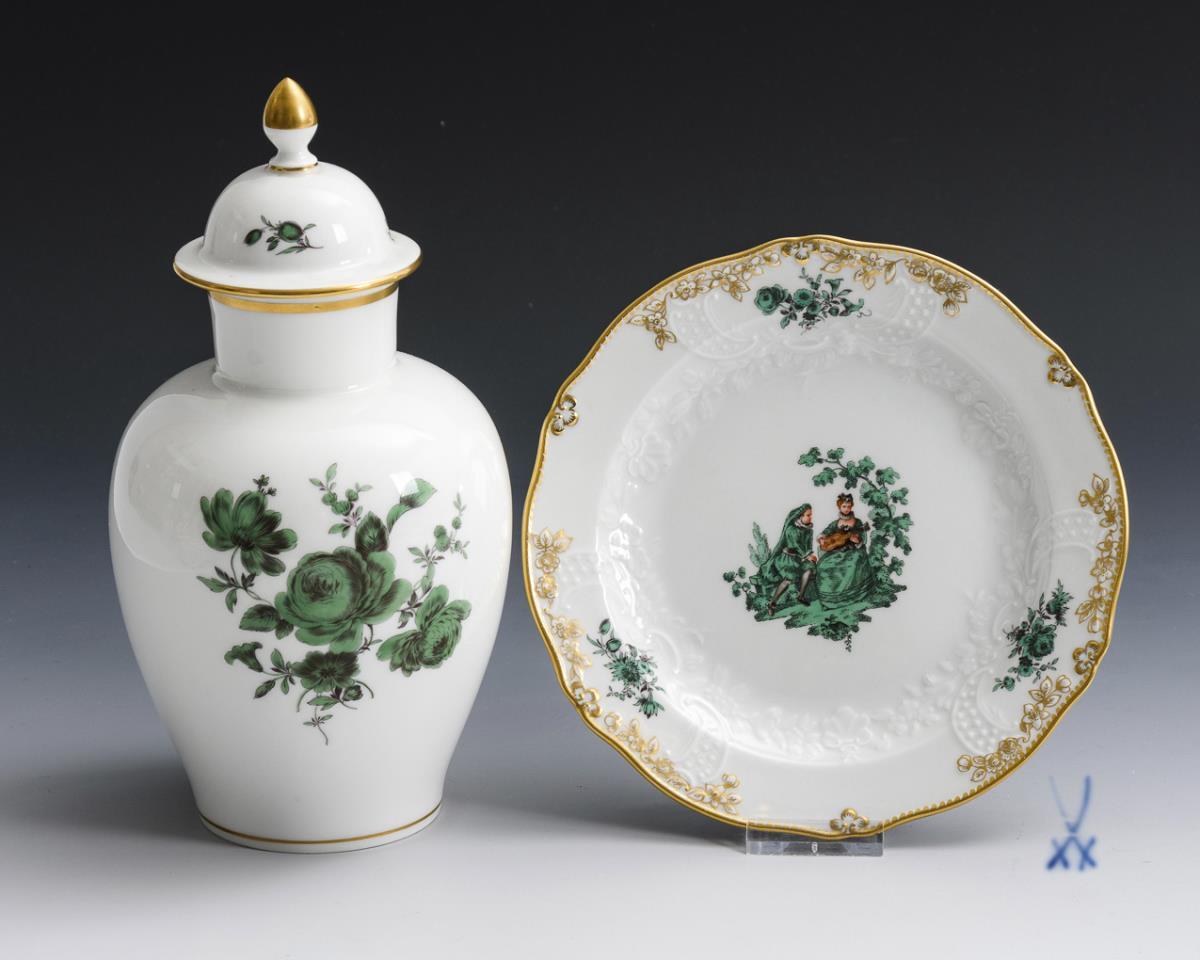 Baluster vase with knobbed lid and floral painting. / Plate in the form "Marseille" with absorbent cotton painting.
