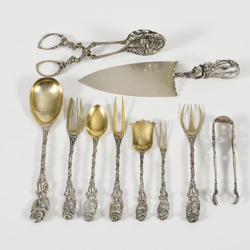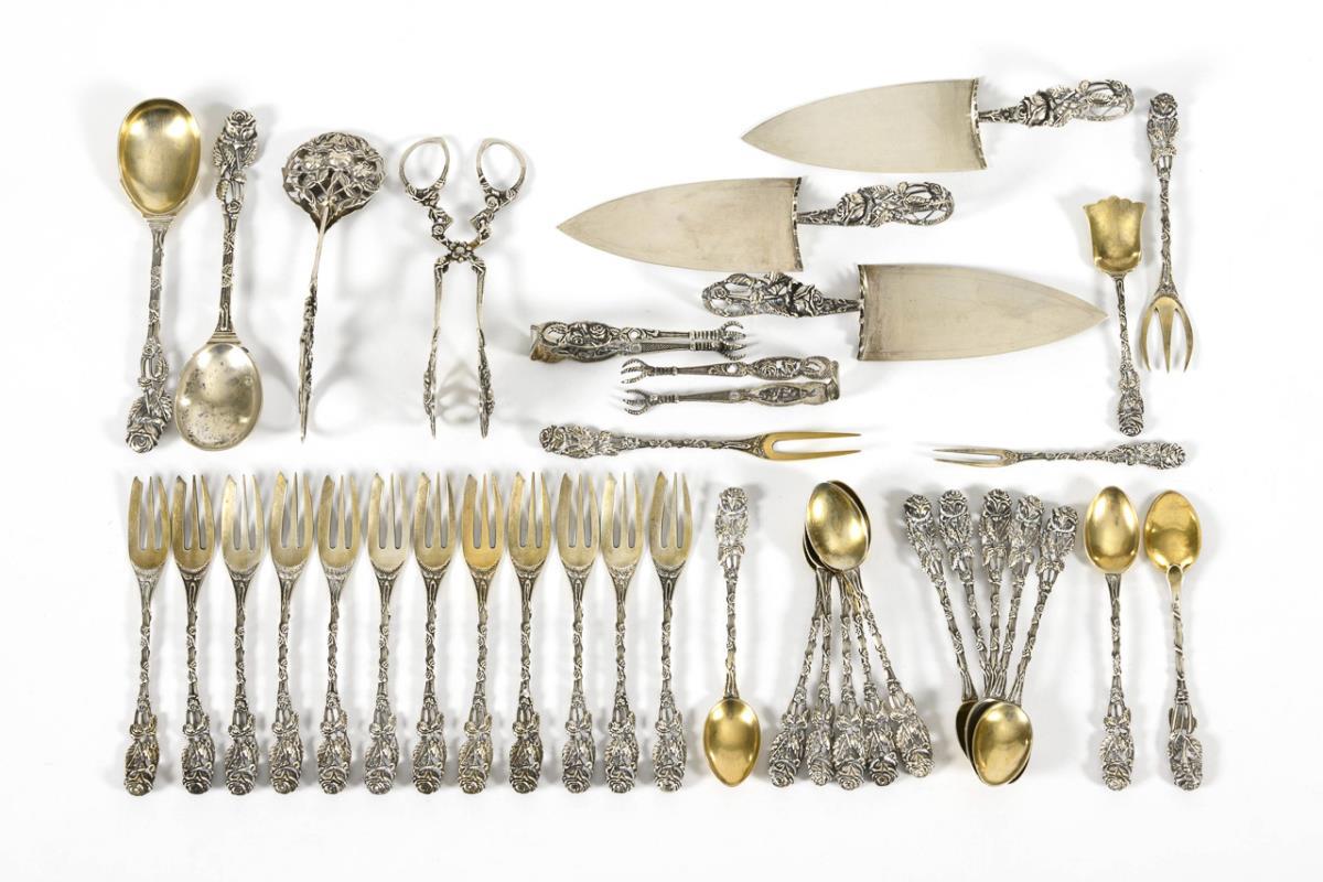 38 richly relieved pieces: 13 serving pieces, 12 cake forks and 13 coffee spoons with gilded spoon.