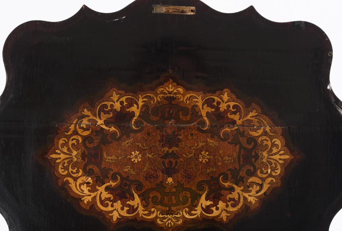 Curved sewing table with folding top, on baluster center support with trefoil-shaped volute base, richly decorated with floral and vine inlays; inside multiple fanned with 6 ornate lids (3 lids missing). Old restored, with stronger signs of age / use, lock defective.