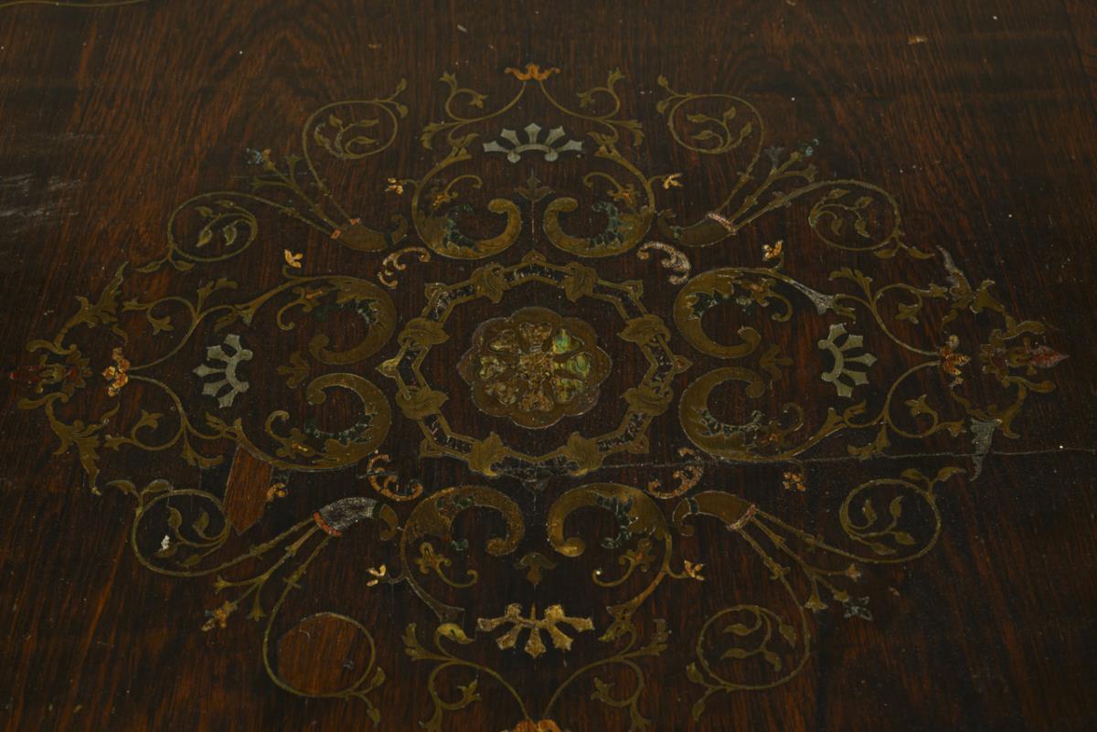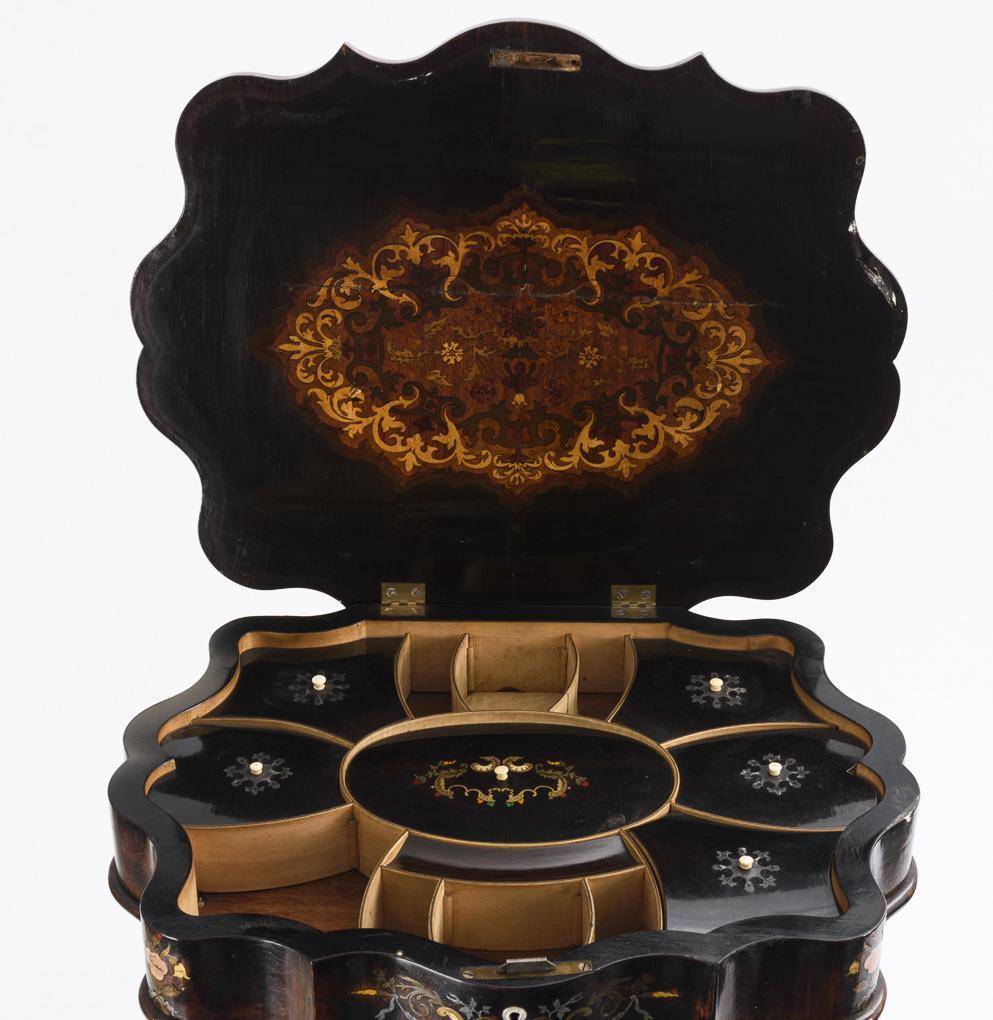 Curved sewing table with folding top, on baluster center support with trefoil-shaped volute base, richly decorated with floral and vine inlays; inside multiple fanned with 6 ornate lids (3 lids missing). Old restored, with stronger signs of age / use, lock defective.