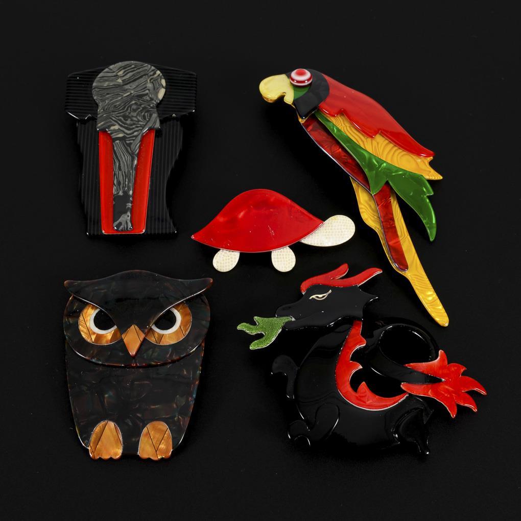 Elephant, dragon, owl, parrot and turtle on signed brooches.