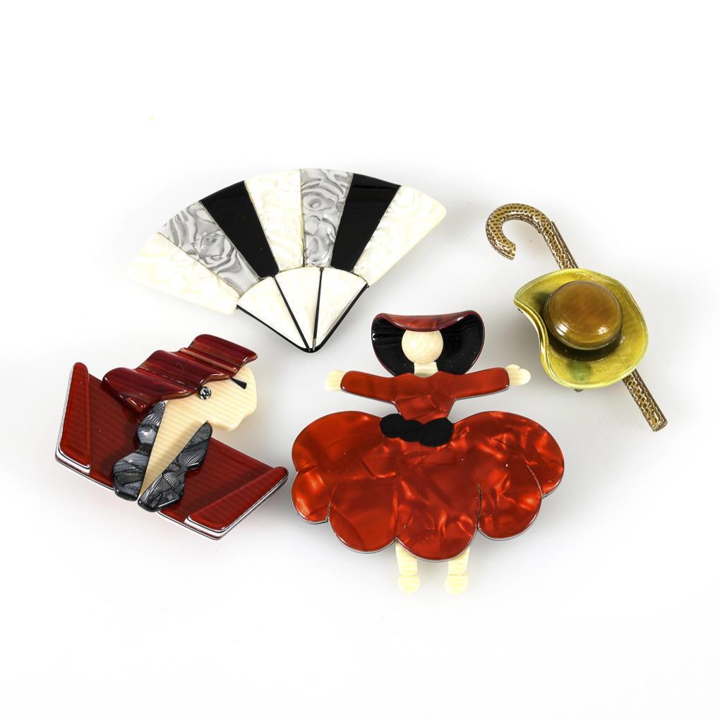 Fashion lady, girl with hat, fan and stick with hat on signed brooches.