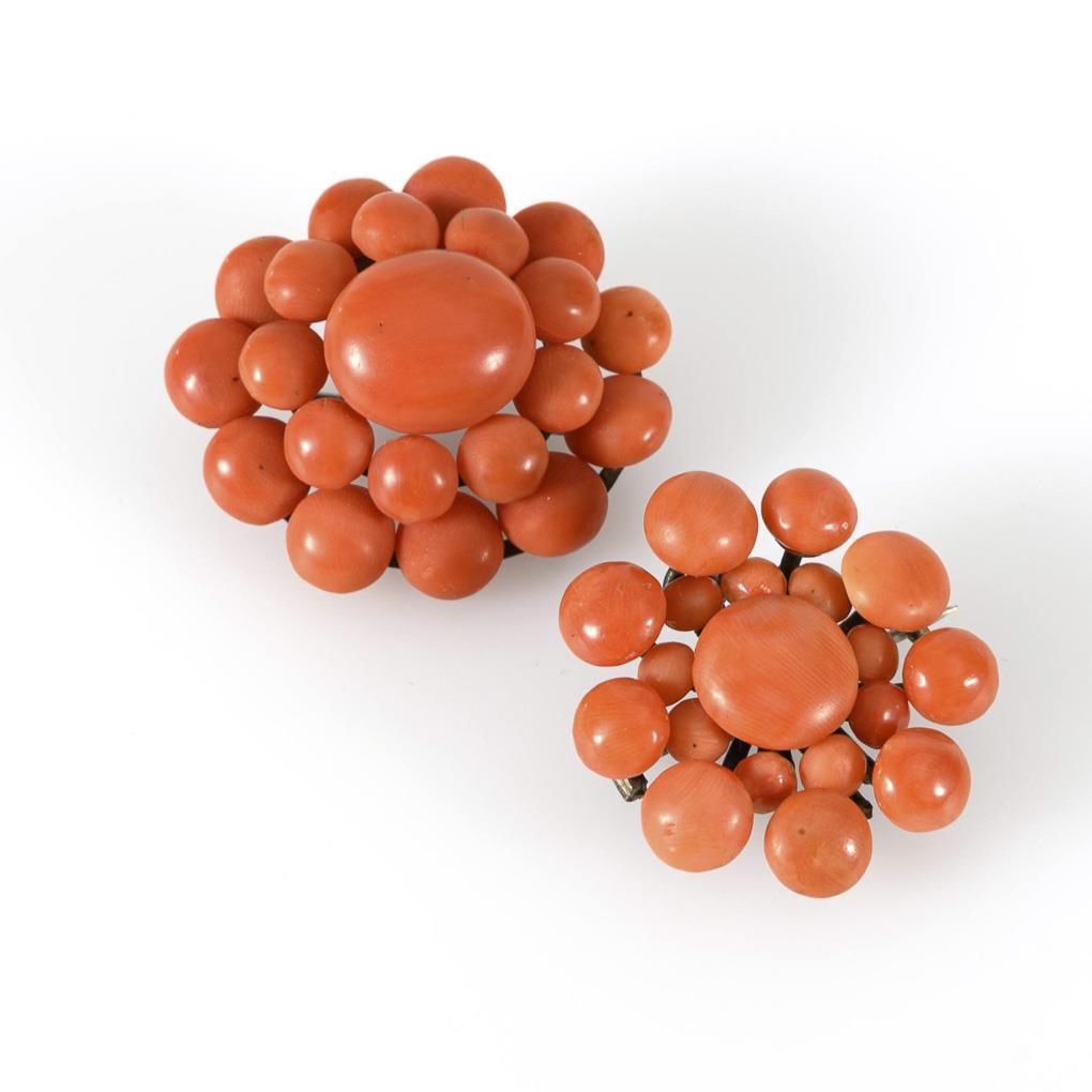 Flower brooches with coral lenses on metal mounts. Hook clasps, 1 with hinged eye.