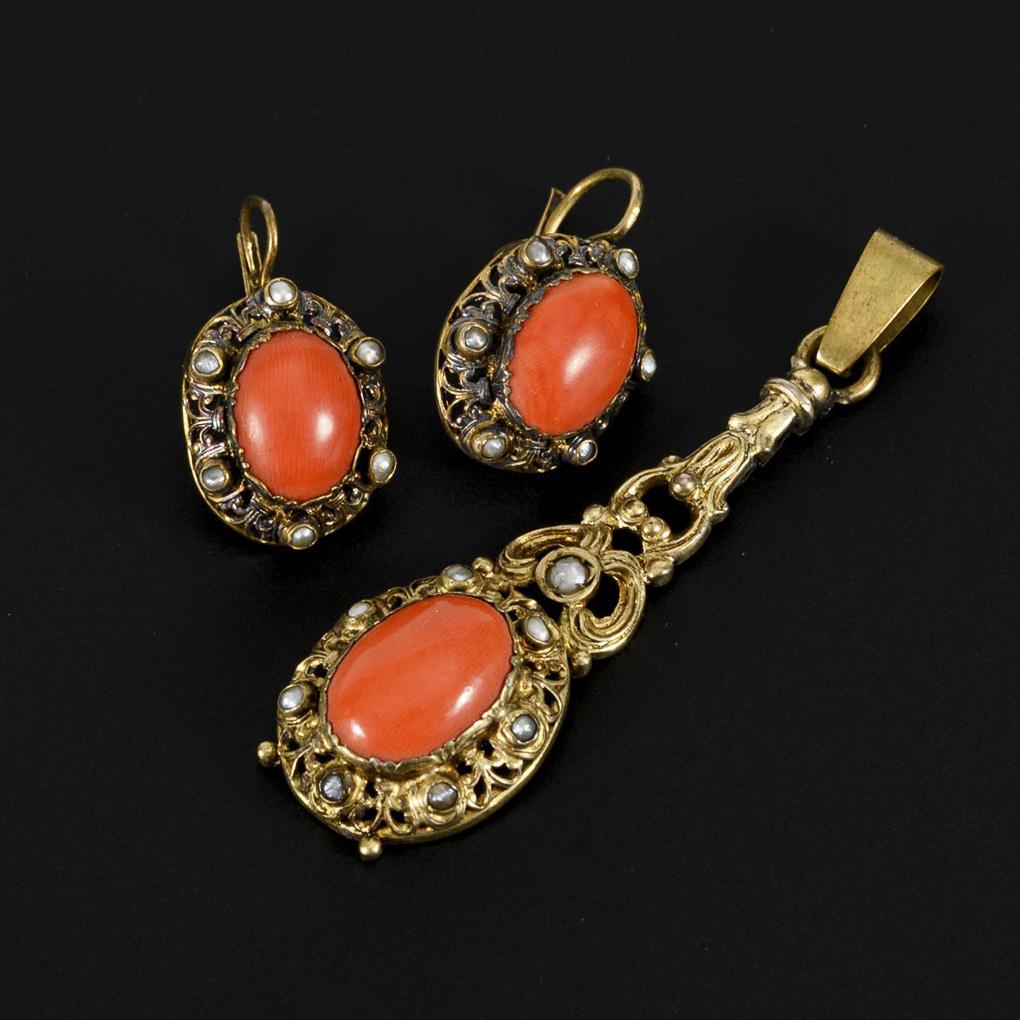 Relief pendant and pair of earrings with casket-set coral cabochons and small half pearls. Spring bail. Pendant with back repaired suspension, supplemented loop.