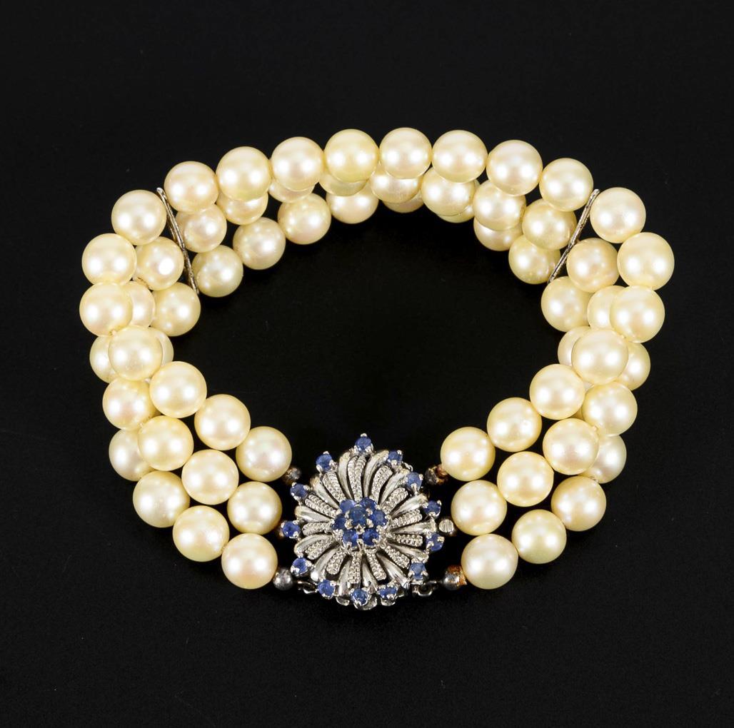 3 row cultured pearl bracelet with sapphires.