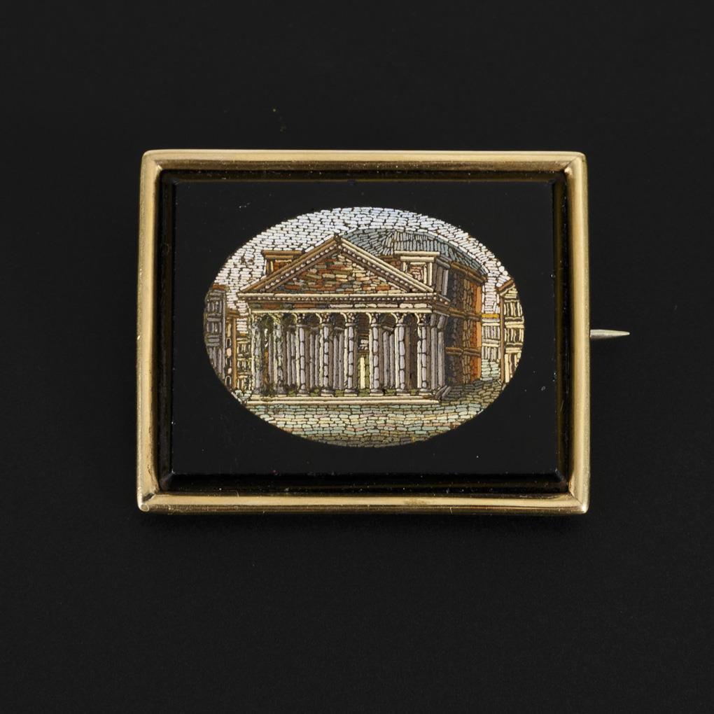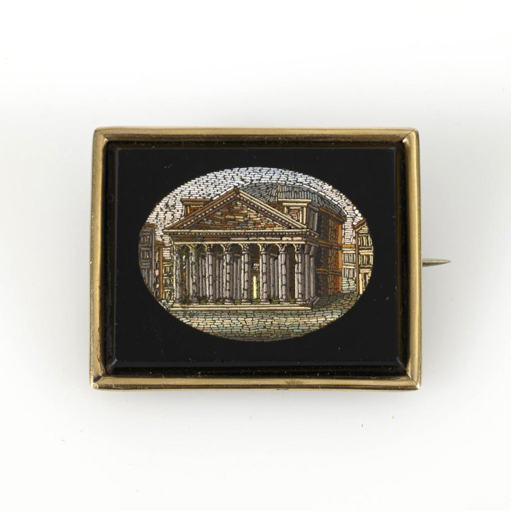 Inlaid glass mosaic with motif of the Pantheon in Rome in open bezel setting. Hook clasp.