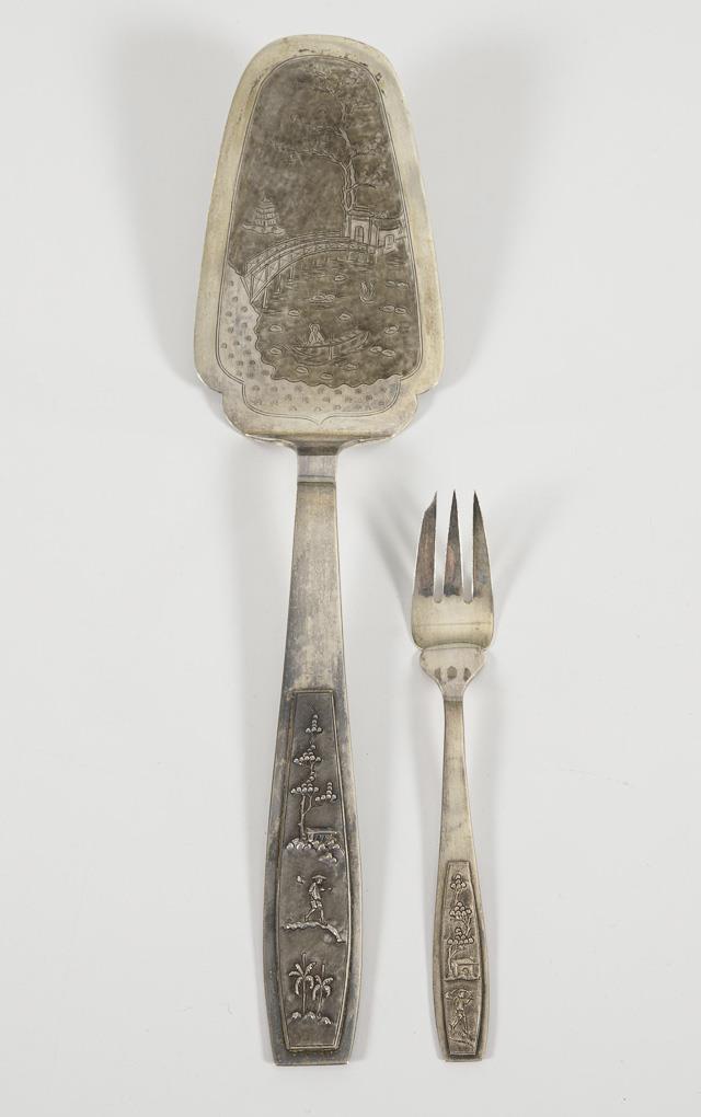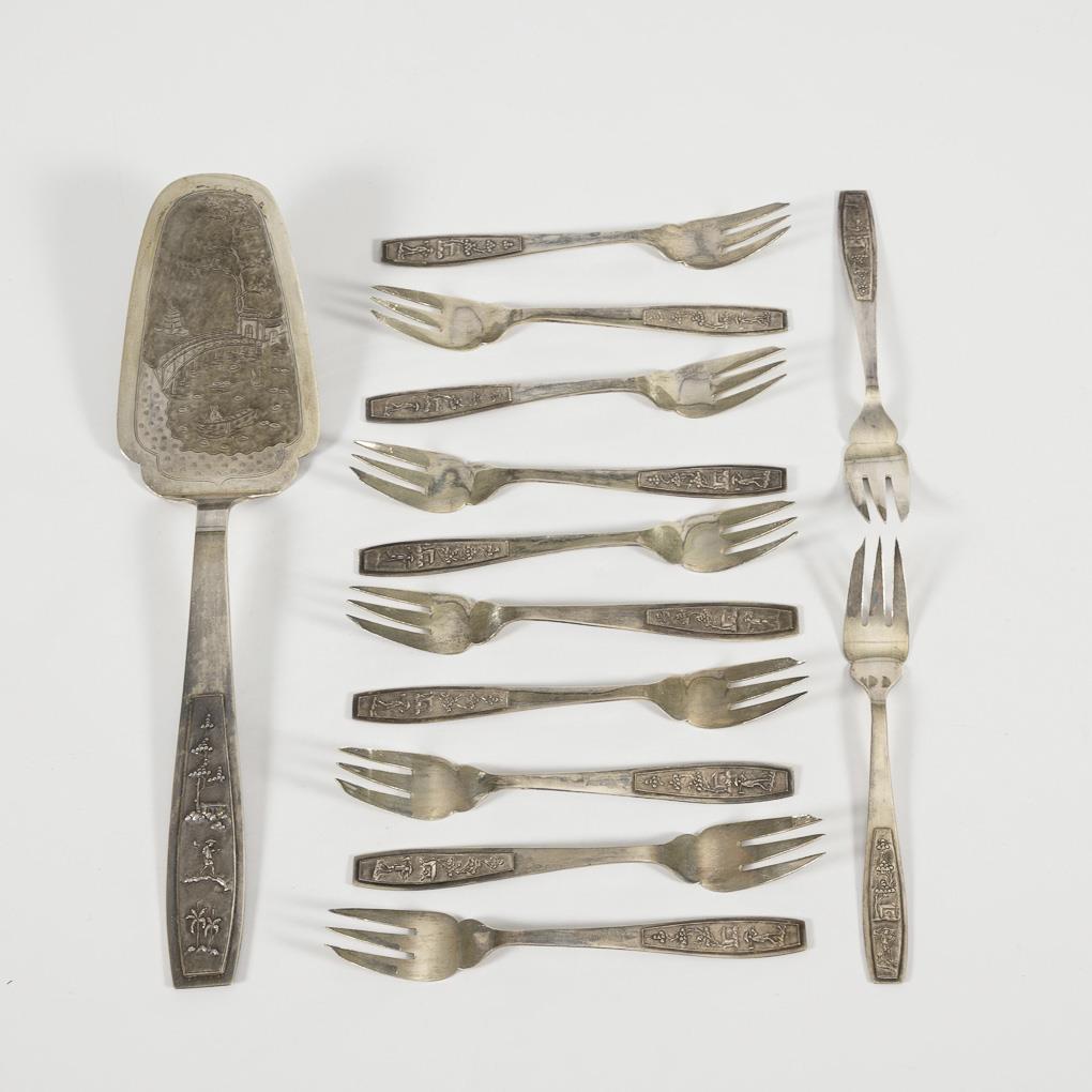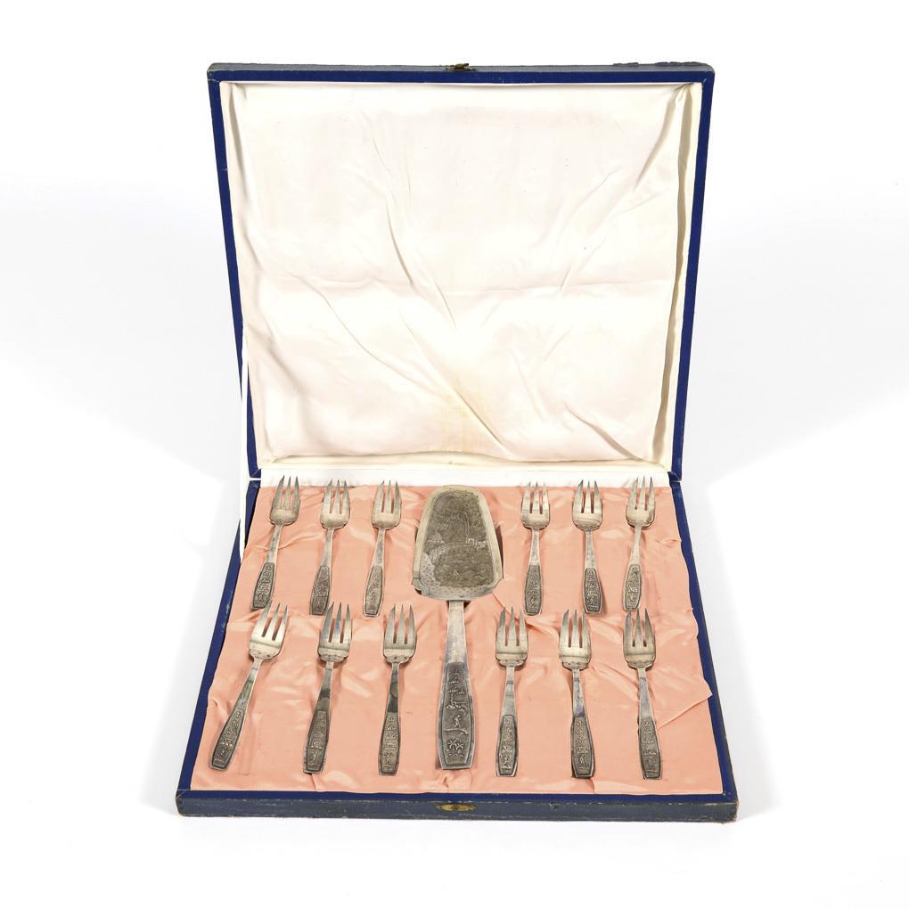 12 cake forks and 1 cake server with figural relief handles. Original case with signs of age.