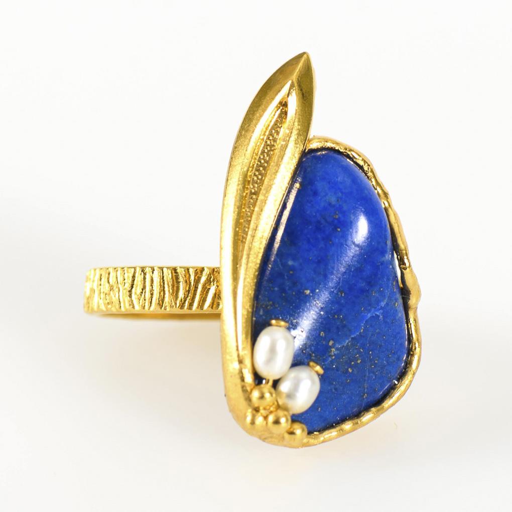Freely designed ring head with lapis lazuli inlay and 2 small cultured pearls, on medium textured rail.