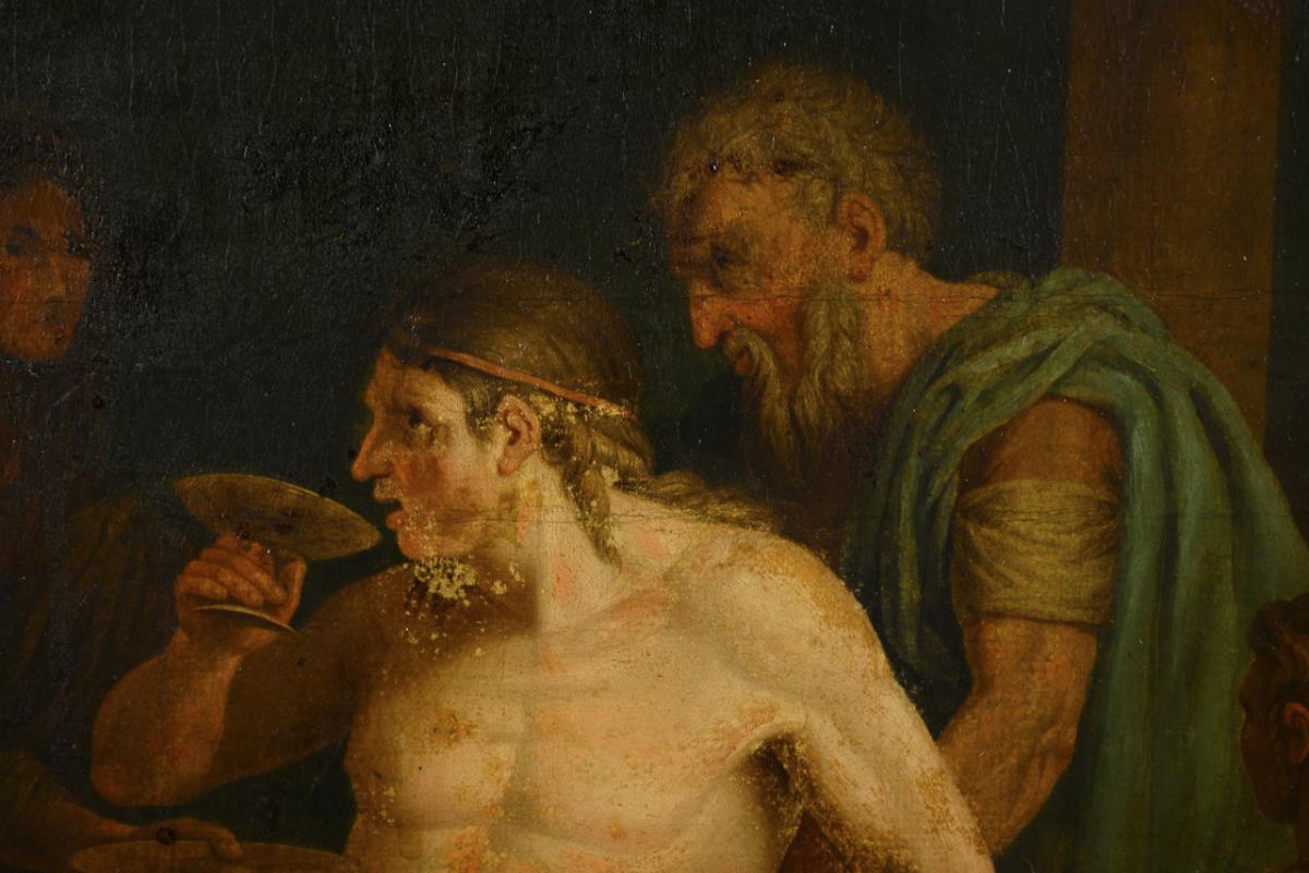 The weakened Macedonian king drinking and listening on the bed, while other advisors and doctors stand around him. Canvas doubled.